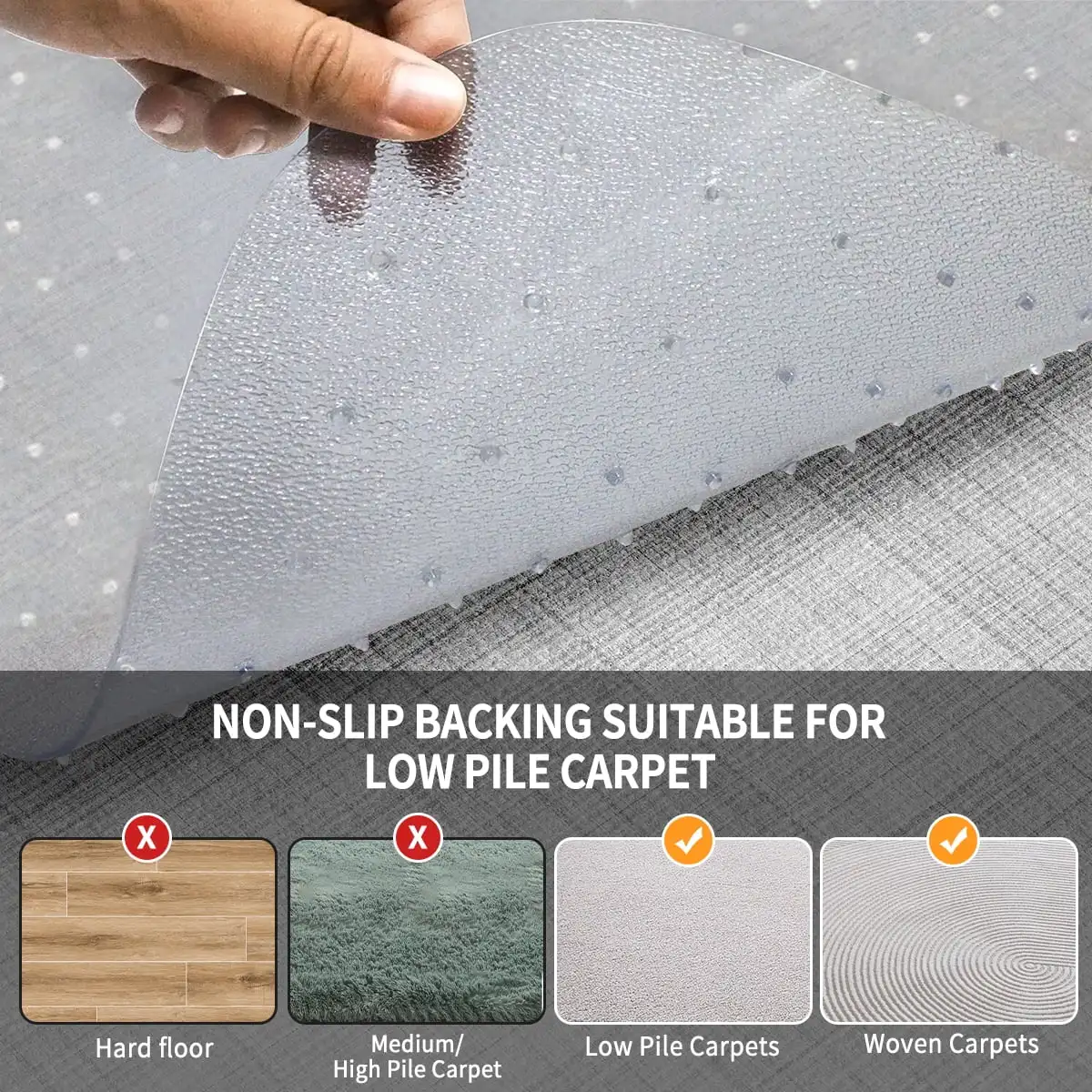 Uniquely crafted for performance, studded spikes on underside securely latch to most carpets; spikes ensure stability and prevents slipping on carpet; before using, test with your foot to ensure it is firmly in position and does not shift.
