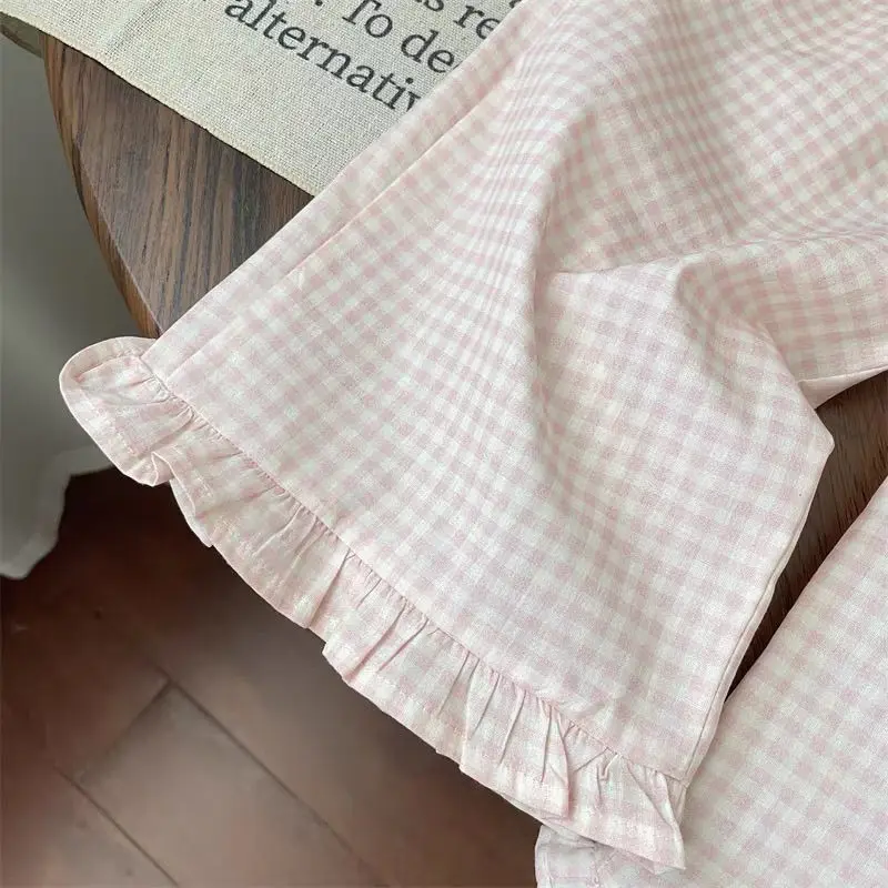 1Set Summer Girls Bow Outfit Baby Infant T-shirt+Pant Set Kids Princess Sweet Short Sleeve Set Children Wide Leg Grid Pants Suit
