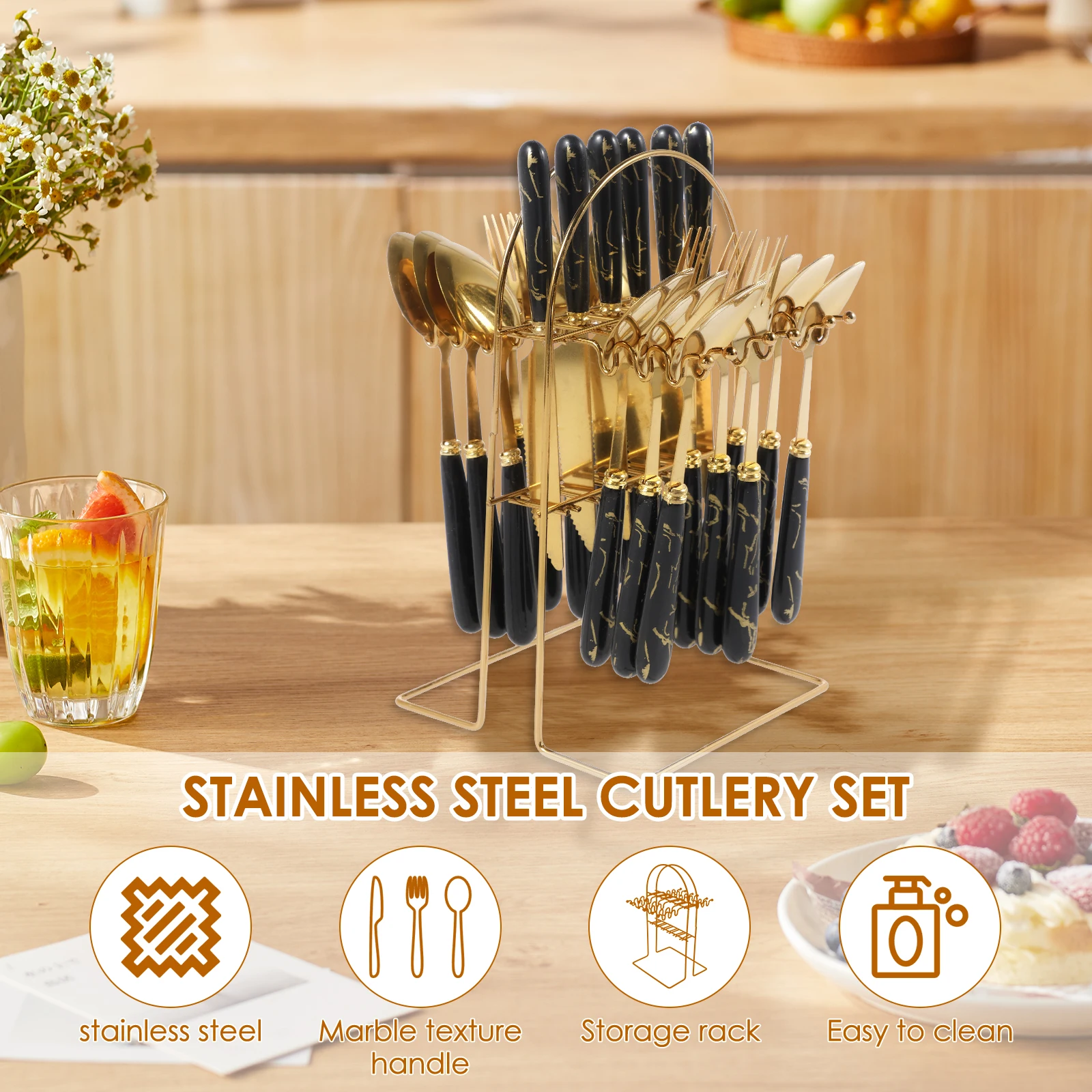 Silverware Holder: The tableware cutlery set also comes with a silverware holder for you. Convenient for drying and storing after washing up, keep your utensils organized and maintain a clean and tidy countertop