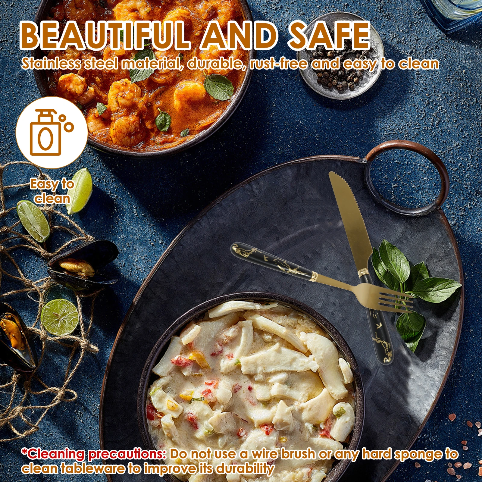 Stainless Steel Silverware Set: Crafted from stainless steel, the silverware set boasts excellent features, including strong; enduring; rust free and easy to clean, ensuring reliable and long lasting use