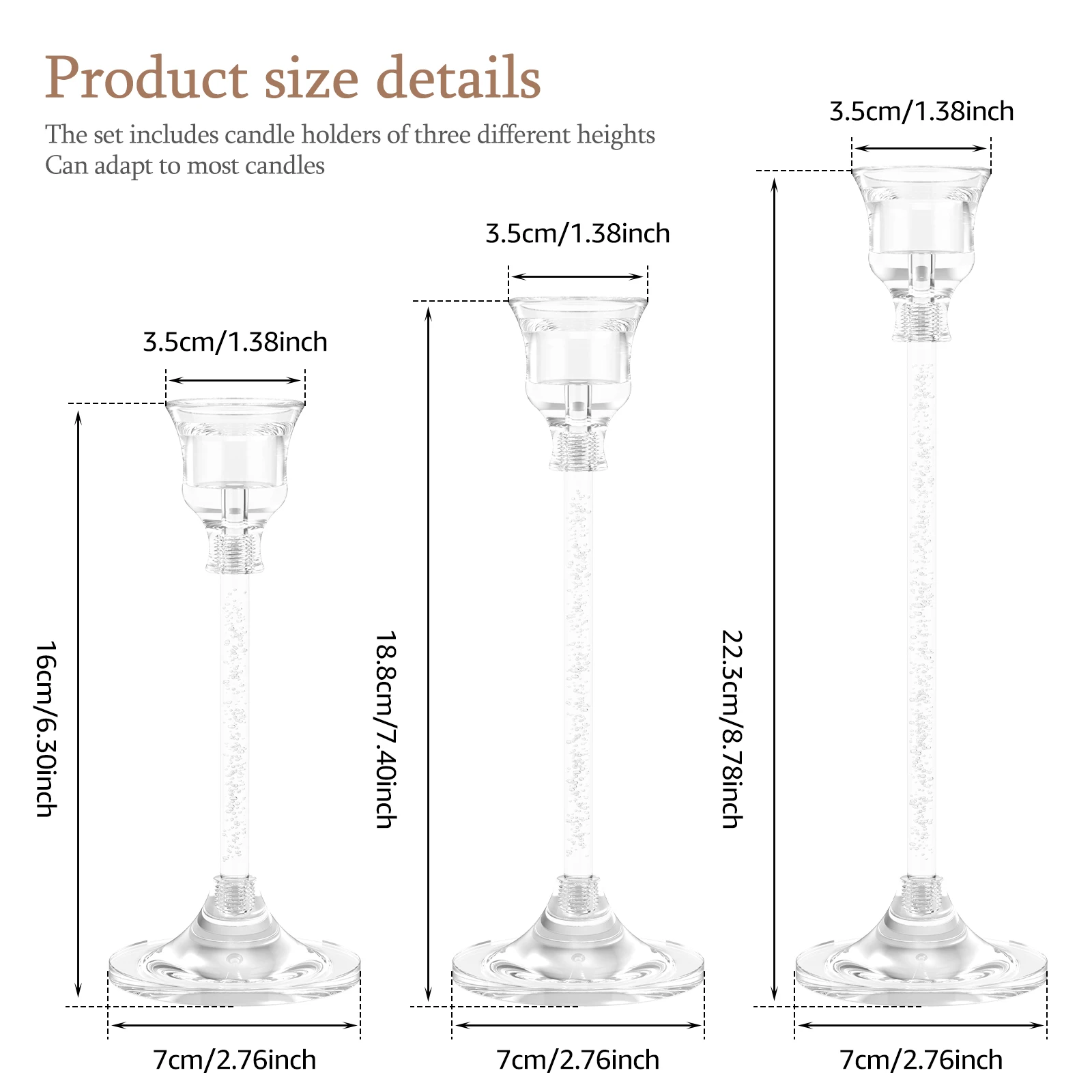 Set of 3 Heights for Versatility: Set includes 3 heights of clear candlestick holders, about 16/18.8/22.3 cm (6.3/7.4/8.78 inches) high, with a base diameter of about 7 cm/2.76 inches and a candle insert diameter of about 2.3 cm/0.83 inches, which is suitable for most candles