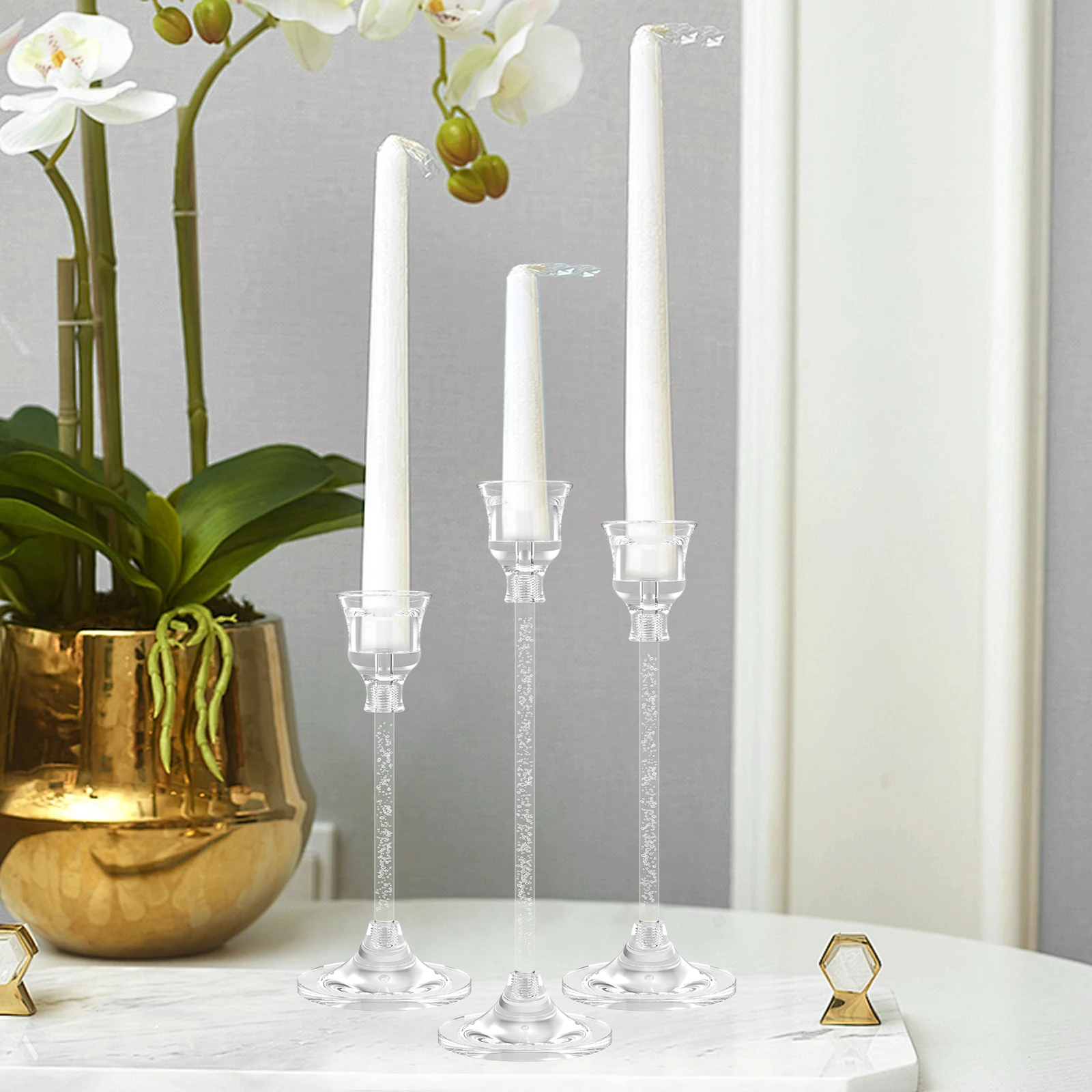 This set of clear candlestick holders combines functionality and style, making it a versatile addition to your home decor. Its minimalist design and quality acrylic structure ensure it complements any setting