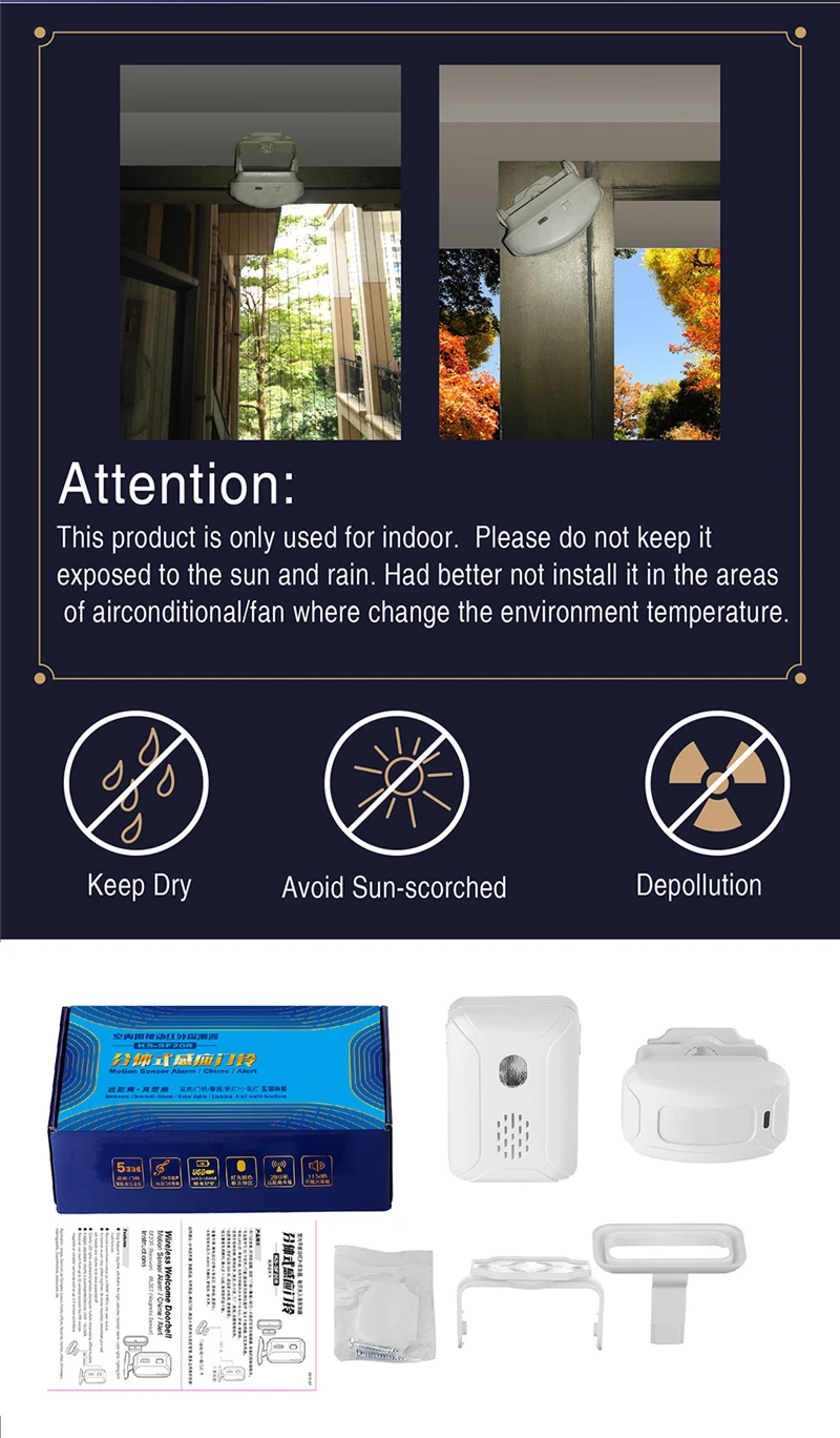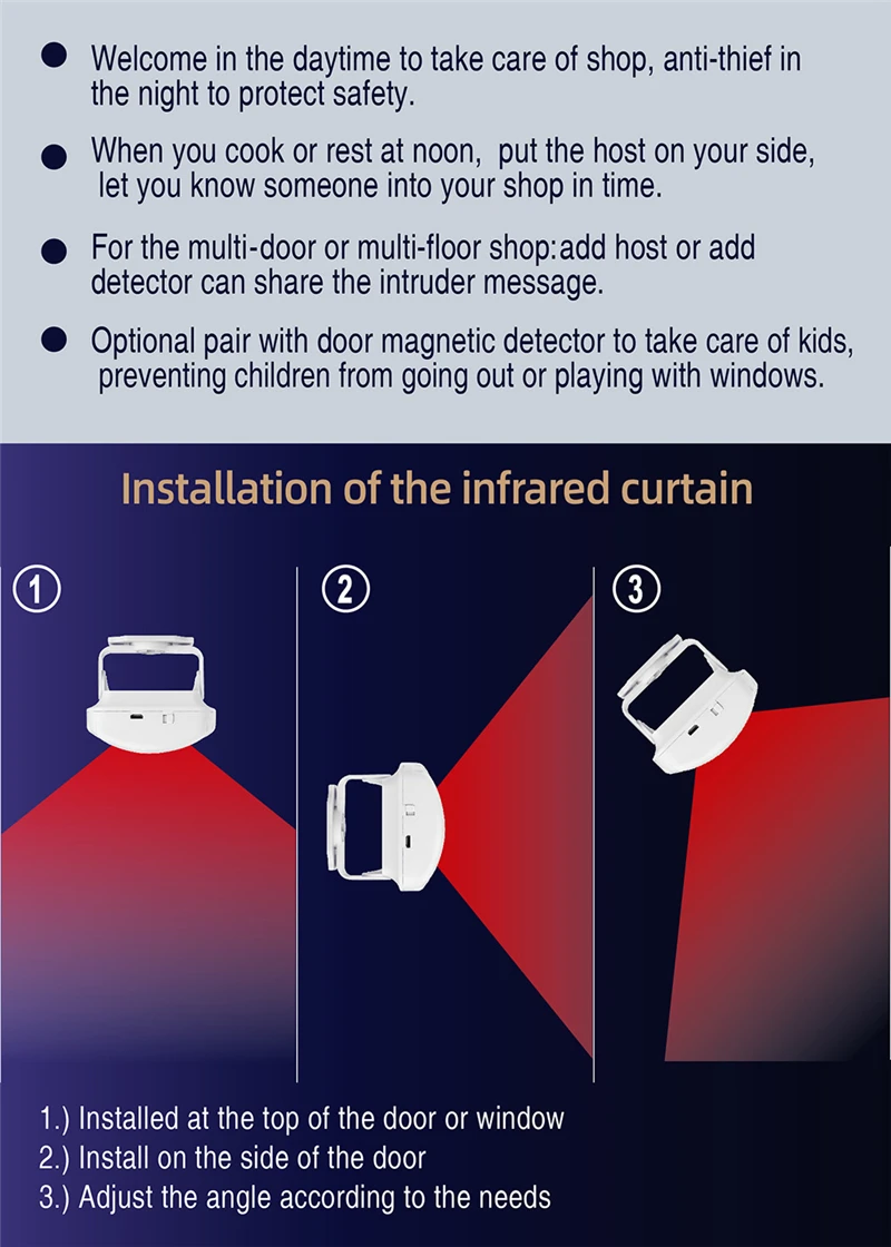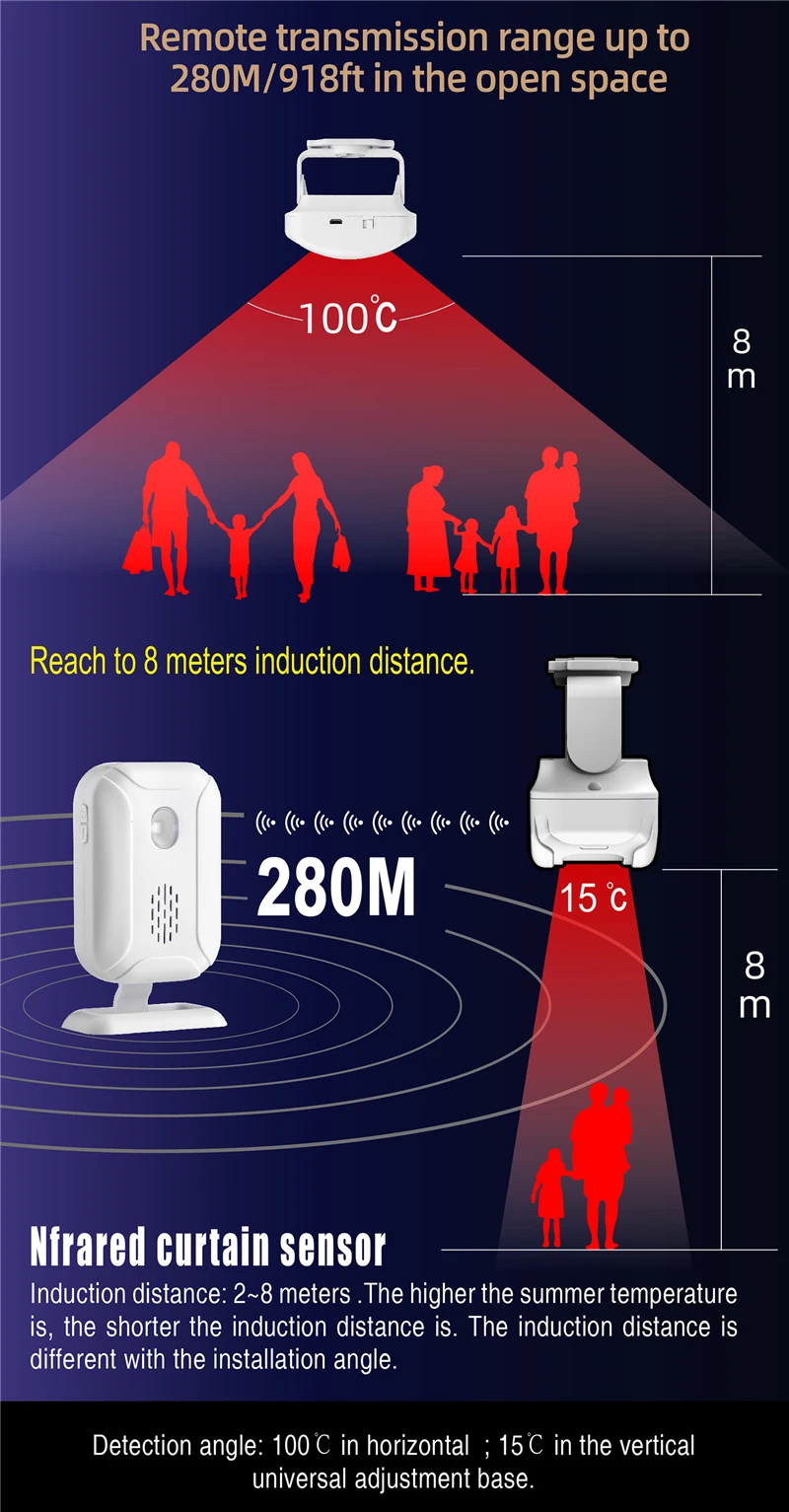 * Infrared curtain: the detection angle in the horizontal direction is 100°, the vertical direction is 15°, the sensing distance: 2-8m (the higher the temperature in summer, the shorter the distance, the installation angle is different, the distance is also different.)