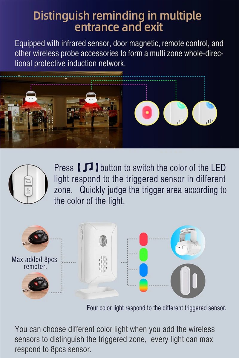* Adjustable brightness of 4 levels of LED lights, colorful LED lights, adjustable brightness, distinguish multiple entrances by different colors. Meet the pain-free environment needs.