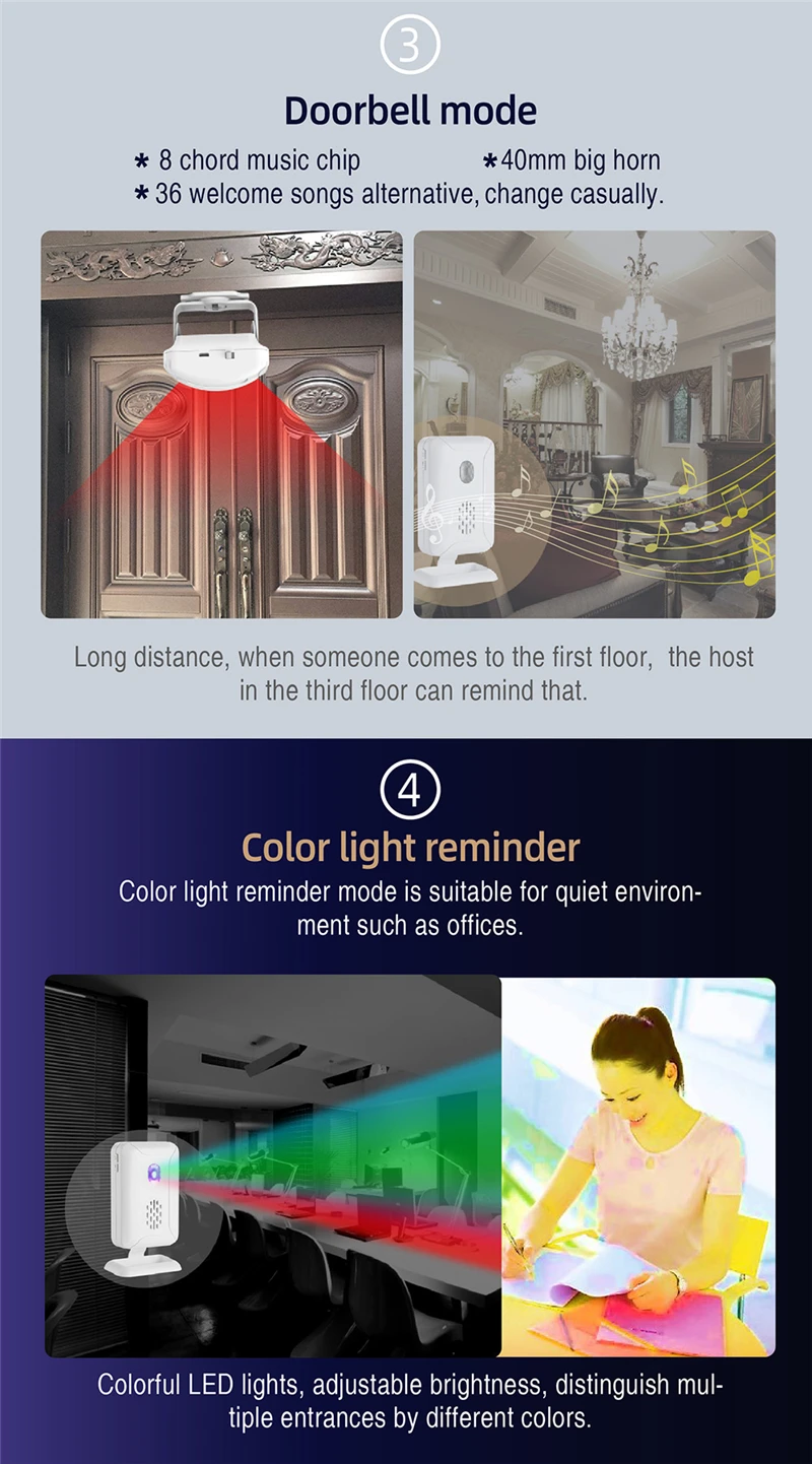 Doorbell mode: open the door bell, 36 optional bells for you to choose.