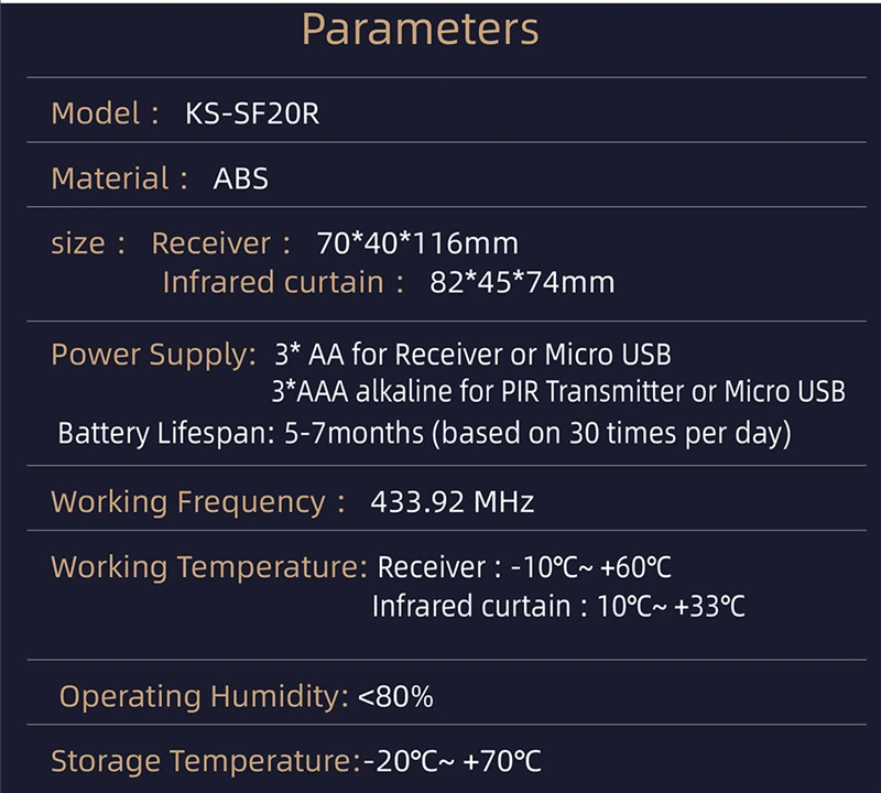 Power supply (infrared curtain): Micro USB or AAA alkaline battery x 3 (not included)