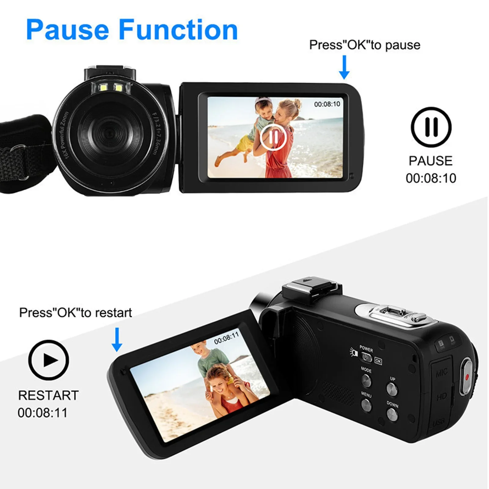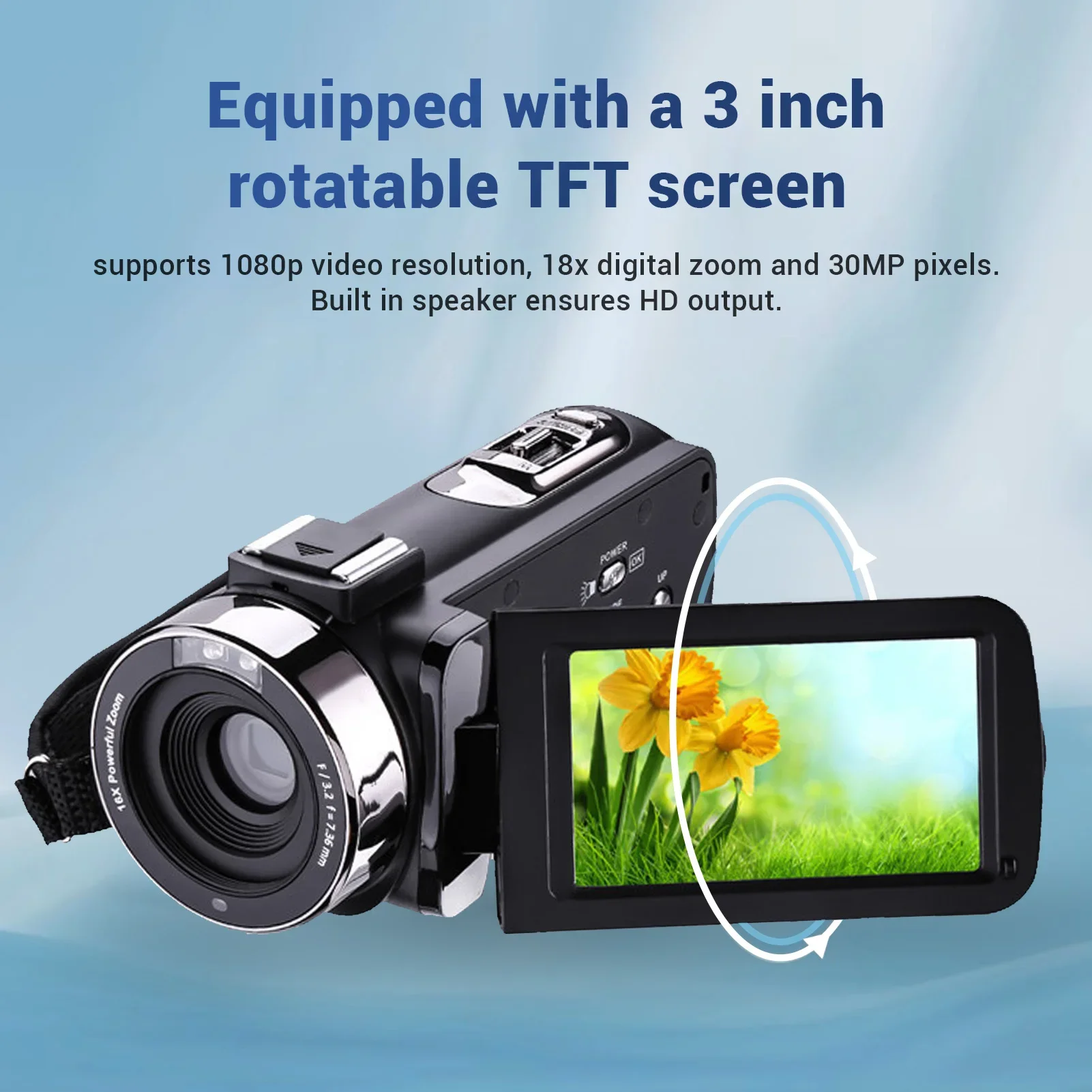 1. HIGH DEFINITION: Equipped with a 3 inch rotatable TFT screen, supports 1080p video resolution, 18x digital zoom and 30MP pixels. Built in speaker ensures HD output.