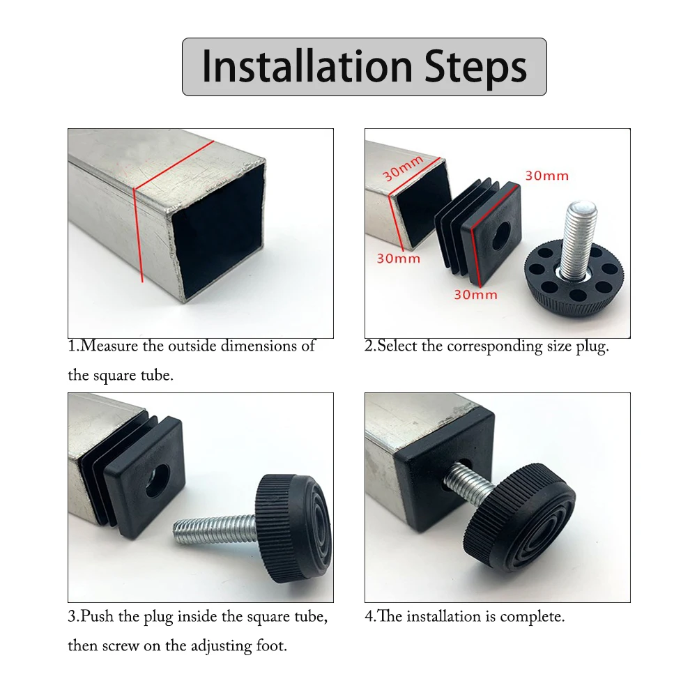 -Size: 20x20xM8 25x25xM8 30x30xM8 38x38xM8 40x40xM8 50x50xM8 20x40xM8 25x50xM8 30x60xM8 30x50xM8 25x38xM8 (please select the corresponding pipe plug according to the external dimensions of the square pipe)