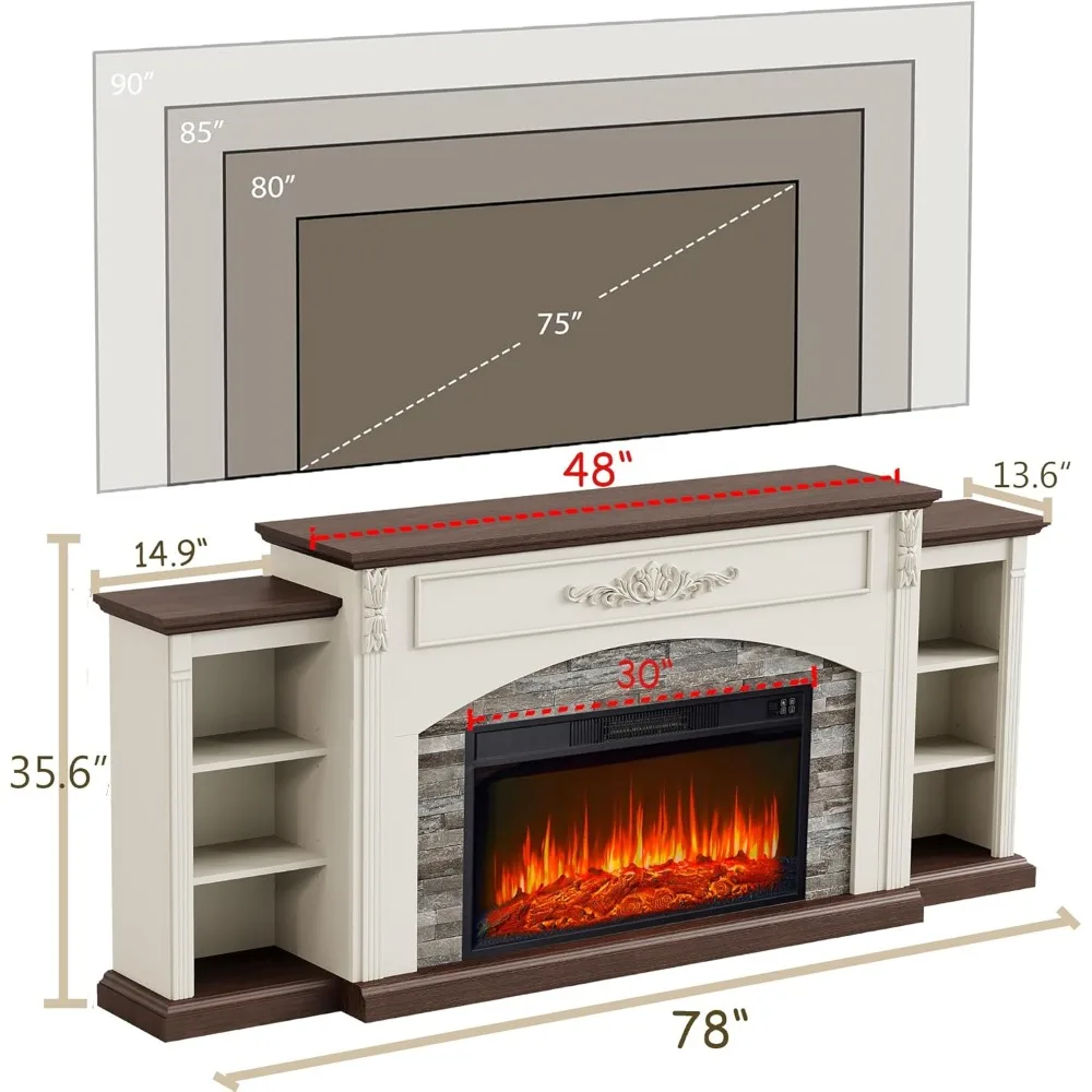 - 【Multifunctional Fireplace Mantel】 fireplace mantel has a natural wood grain tabletop and a thicker, more stable base. This 78“ fireplace mantel with storage comes with adjustable shelves and can be used as a TV stand up to 90inch TV, suitable for both living room and bedroom.