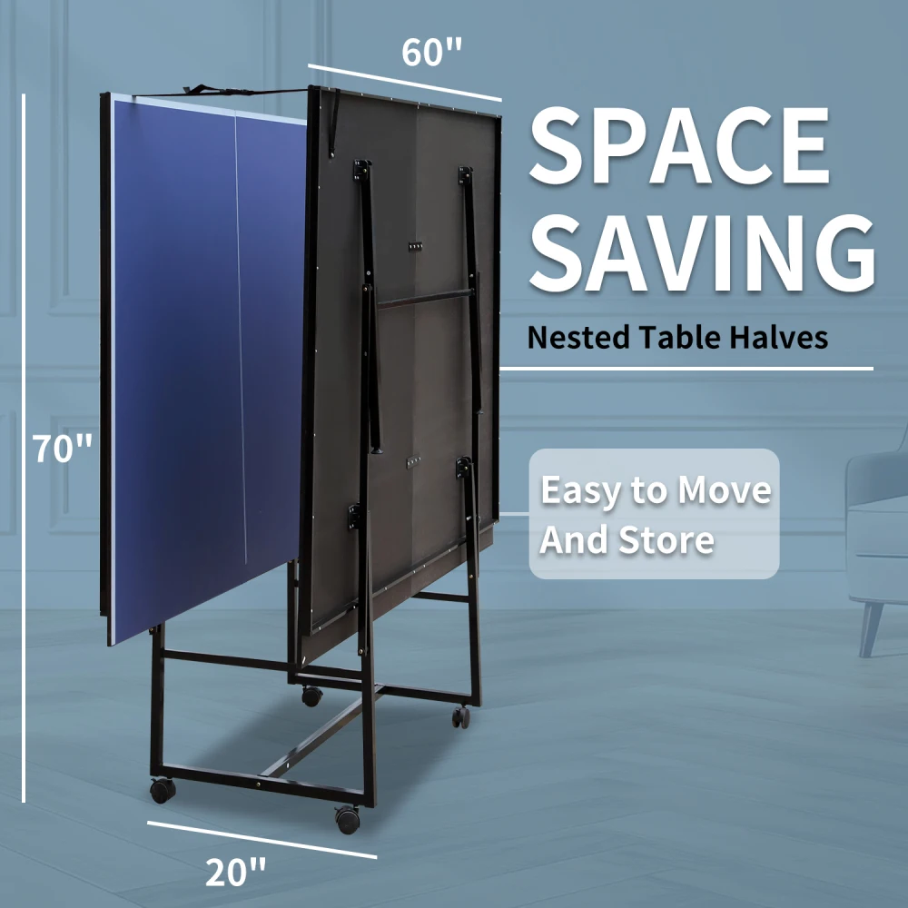 - 【Easy to Store】Our table tennis table can be folded on each half, the double locking mechanism can keep it folded for easy storage; with wheels on the bottom and lockable, it can be easily moved and secured to the storage place or playing field.