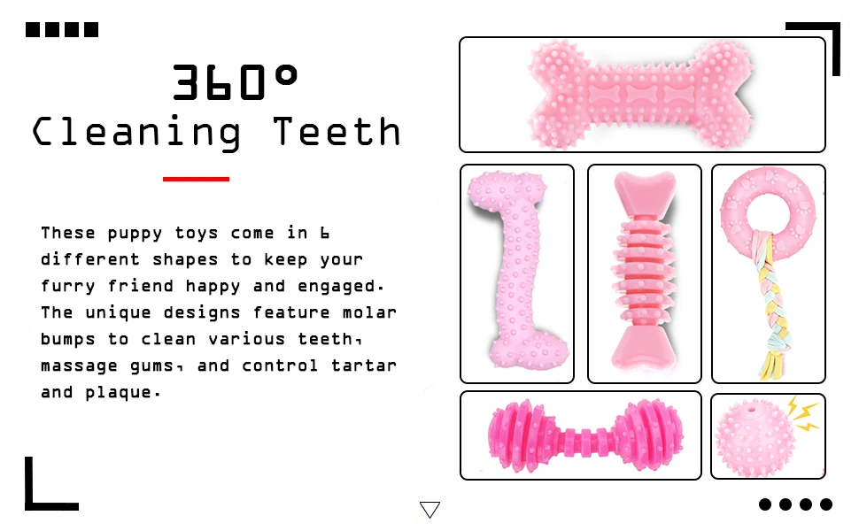 6 different shapes of dog chew toys: These dog toys come in 6 different shapes to make your furry friends happy and engaged. Unique design with raised molars, capable of cleaning various teeth, massaging gums, and controlling plaque and plaque.