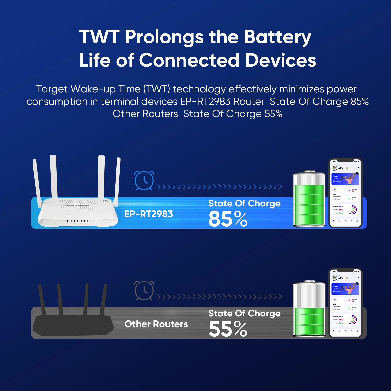 Target Wake – up Time ( TWT ) technology effectively minimizes power consumption in terminal devices EP -RT2983 Router State Of Charge 85%, Other Routers State Of Charge 55%.