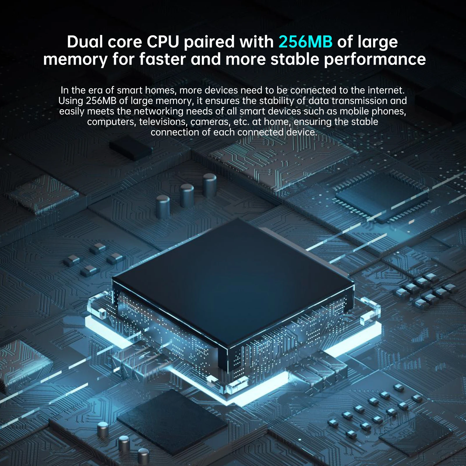 In the era of smart homes , more devices need to be connected to the internet . Using 256MB of large memory , it ensures the stability of data transmission and easily meets the networking needs of all smart devices such as mobile phones, computers , televisions , cameras , etc. at home , ensuring the stable connection of each connected device .