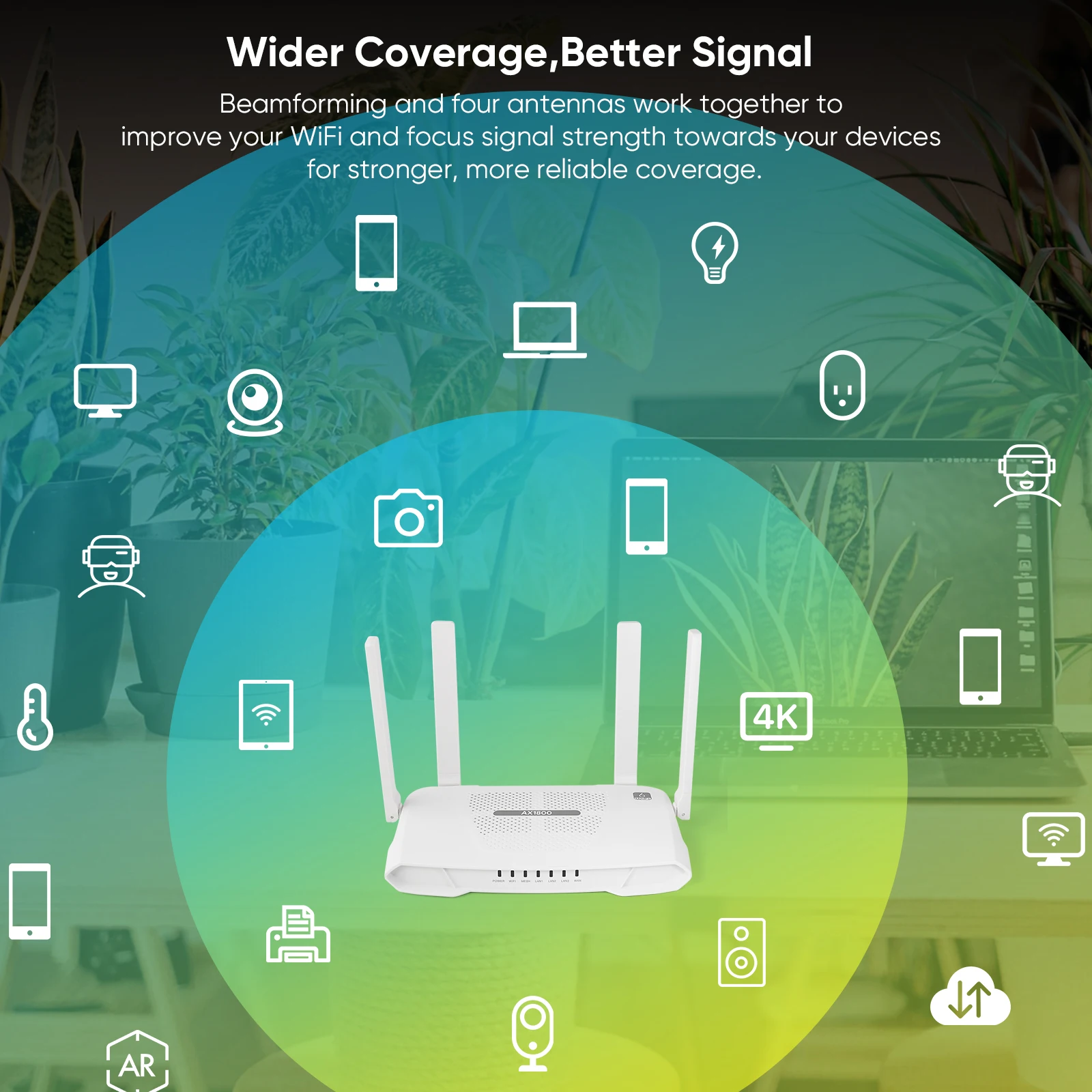 Beam-forming and four antennas work together to improve your WiFi and focus signal strength towards your devices for stronger, more reliable coverage.