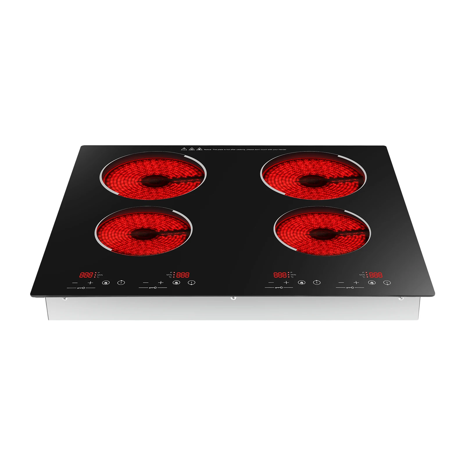 The electric ceramic cooktop is an ideal choice for your modern kitchens. It features four electric burners, offering ample space for all your cooking needs. It can adjust the power, temperature, and time so that you can accurately cook the best-tasting ingredients. Crafted using a high-quality black crystal panel and galvanized plate, it is not only durable but also easy to clean. Upgrade your cooking experience with our ceramic cooktop and enjoy delicious meals in style.