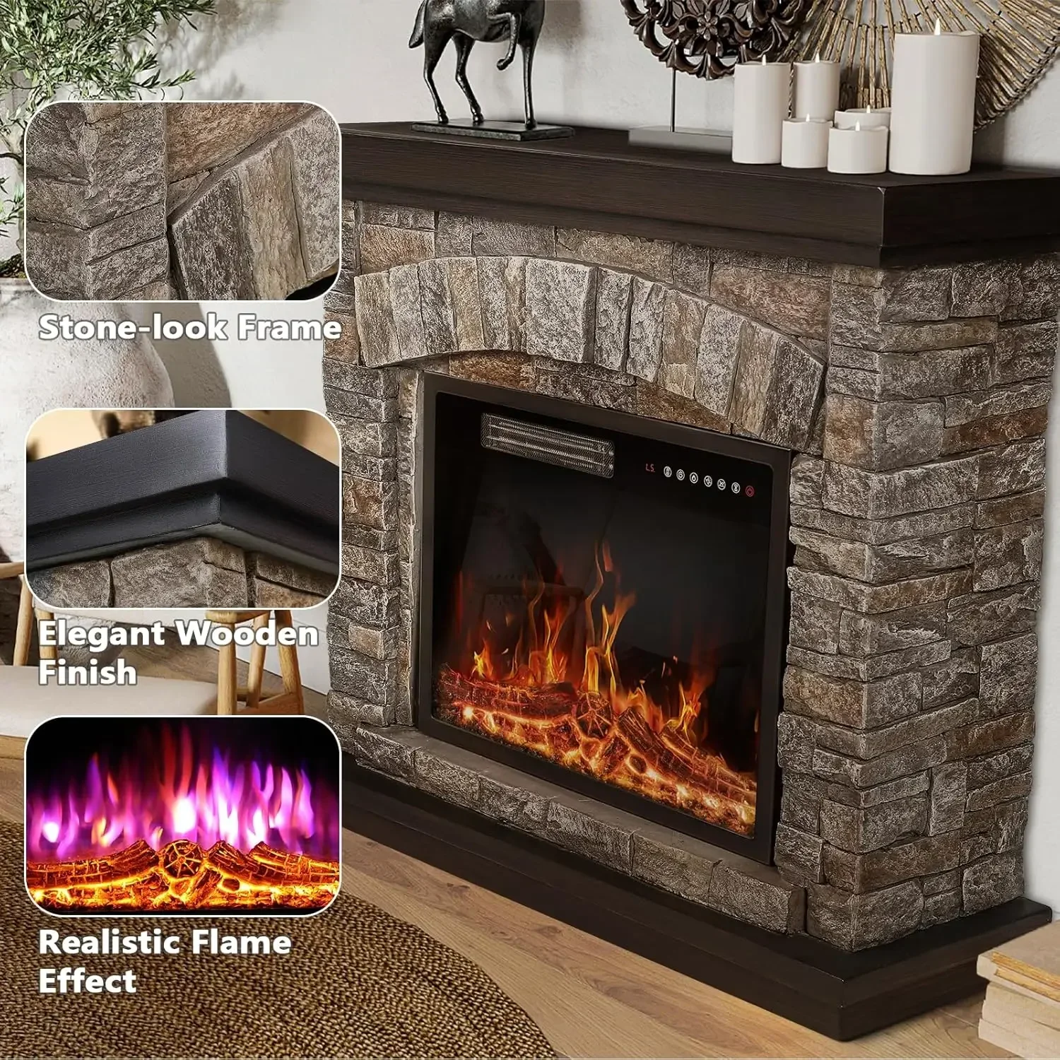 Electric Fireplace with Mantel,Freestanding Stone Fireplace Heater TV Stand with Remote Control, Realistic Flame Effect &3D Log $1,109.91
