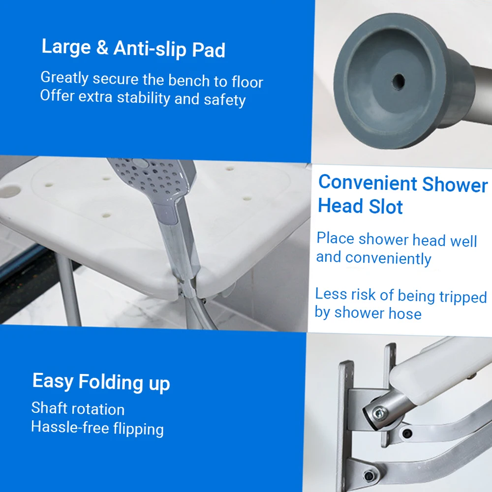 This wall-mounted folding shower bench uses reliable aluminium alloy tube supporting up to 440lbs approximately, features comfortable seat, anti-slip feet, convenient shower head slots, fits the elderly, disabled, individuals with limited mobility or having trouble in standing, helps them sit and shower safely while in the shower, creates a safe and pleasant bath experience. When the shower bench is not needed, it can be flip-up, suitable to use in your bathroom.