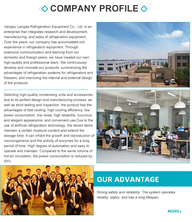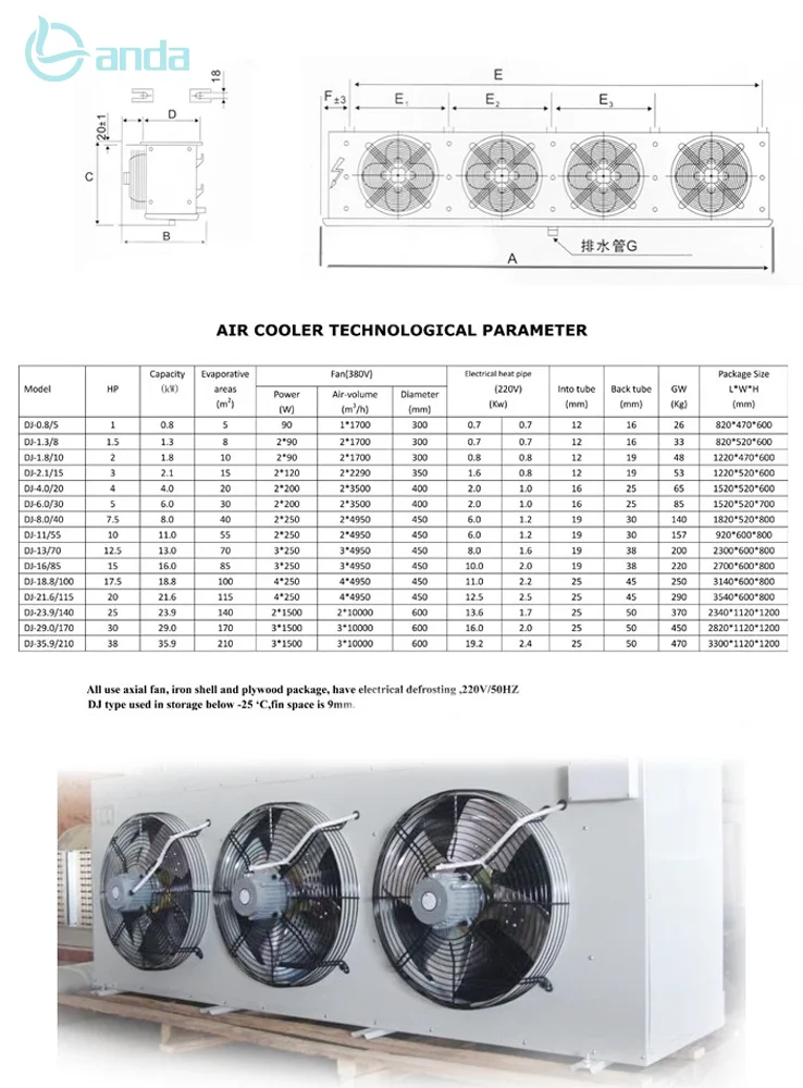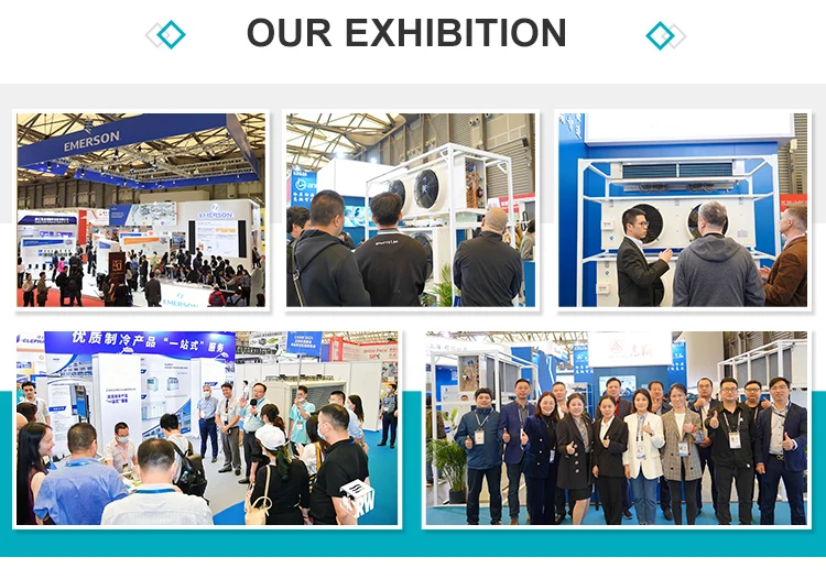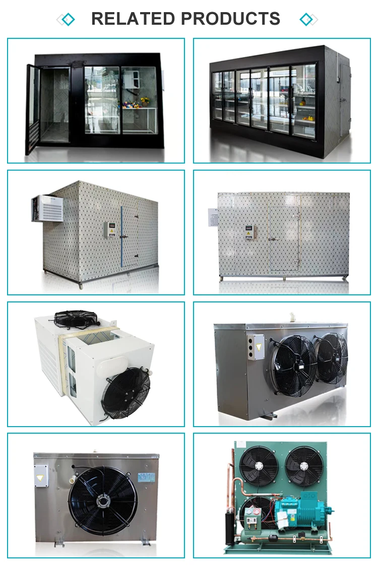 1. Capacity design based on the most popular compressor sizes in the range 2. High efficiency coils made of high quality 16mm copper tube diameter and special profile aluminum fins. 3. coil block made of strong fins to withstand cleaning process 4.Drain tray design with drain slop to minimize tray 5. 100% leakage tested at 30 bar. 6. Durable material, thin and hard coating, hard glossy powder coated or white powder coated aluminum, high strength, corrosion and shock resistant, environmentally friendly Features: Refrigerator unit only for high, medium and low temperatures (+10°C – -35°C) 1. light weight, easy winding, compact structure, fast temperature drop, long preservation time. 2. High-efficiency fins, more evaporation area. 3. Mechanical tube expansion, fins and copper tubes are closely connected to improve heat exchange efficiency. 4. Bright type copper tube thickness: 0.35mm, elbow with silver brazing. 5. Motor: high efficiency, low power consumption, strong winding, wide range, low noise, long service life. 6. More than 2.6MPa pneumatic test allows, reasonable design, power saving 25%. 7. Cold rolled steel plate for the shell, phosphating static spraying technology, beautiful shape, anti-rust. 8. Defrost thermal performance: 8 hours defrost cycle.