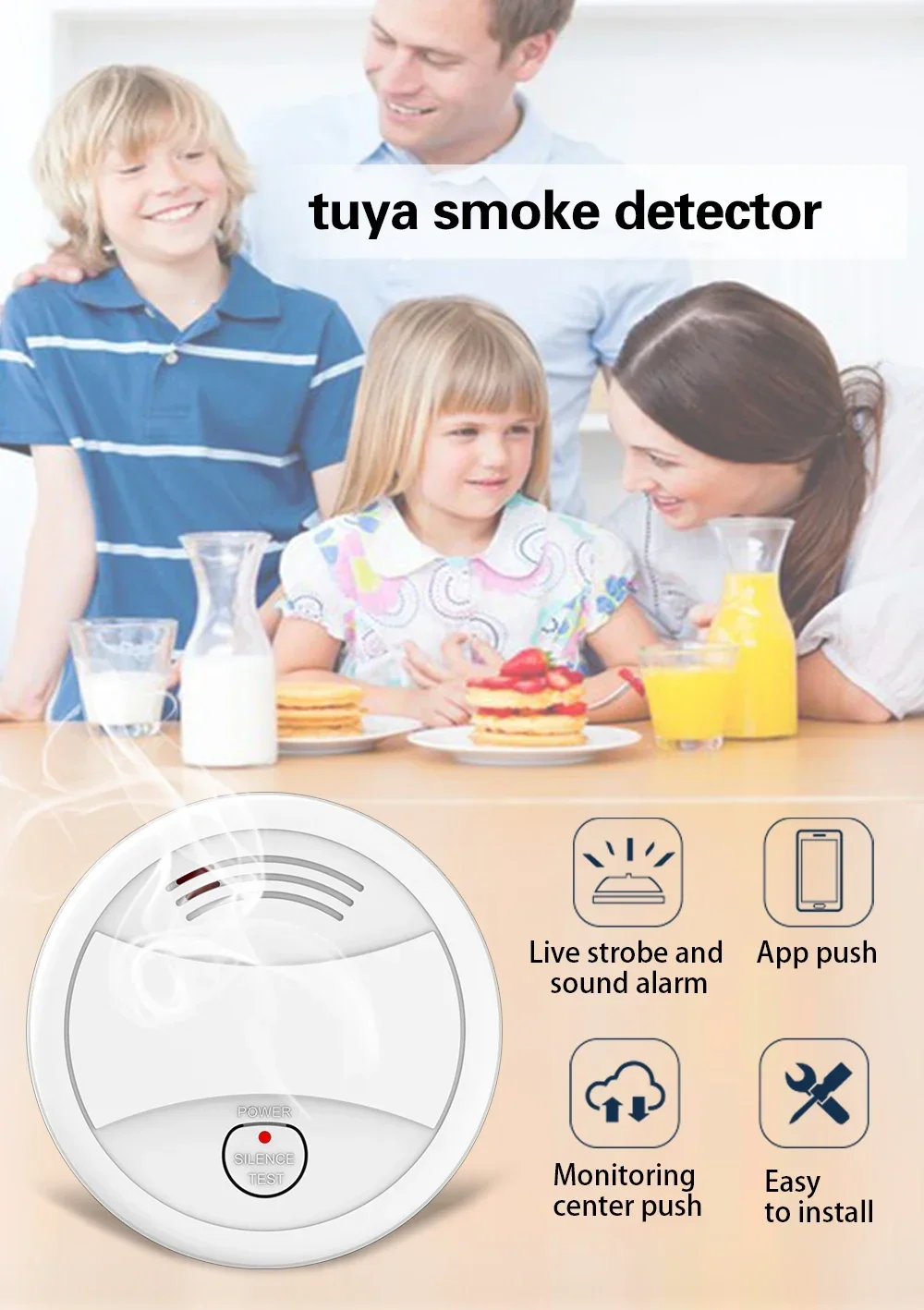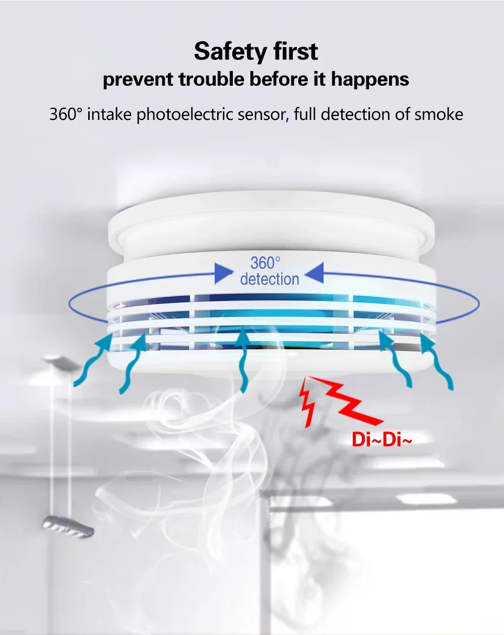 When smoke concentration exceeds the limit,the detector will immediately send alarm signal and app push notifications to the user