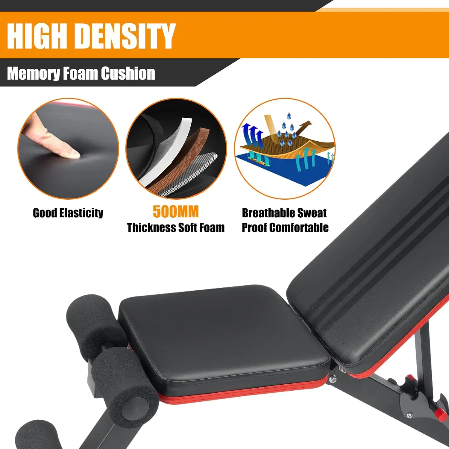 * 銆怳ltimate in Comfort銆慣he high density foam pad of the backrest, headrest, and seat is firm and supportive, allows you to perform any exercise with maximum comfort. It is wrapped by premium quality, water resistant PU leather to leave you at peace when you break into sweat during workout.