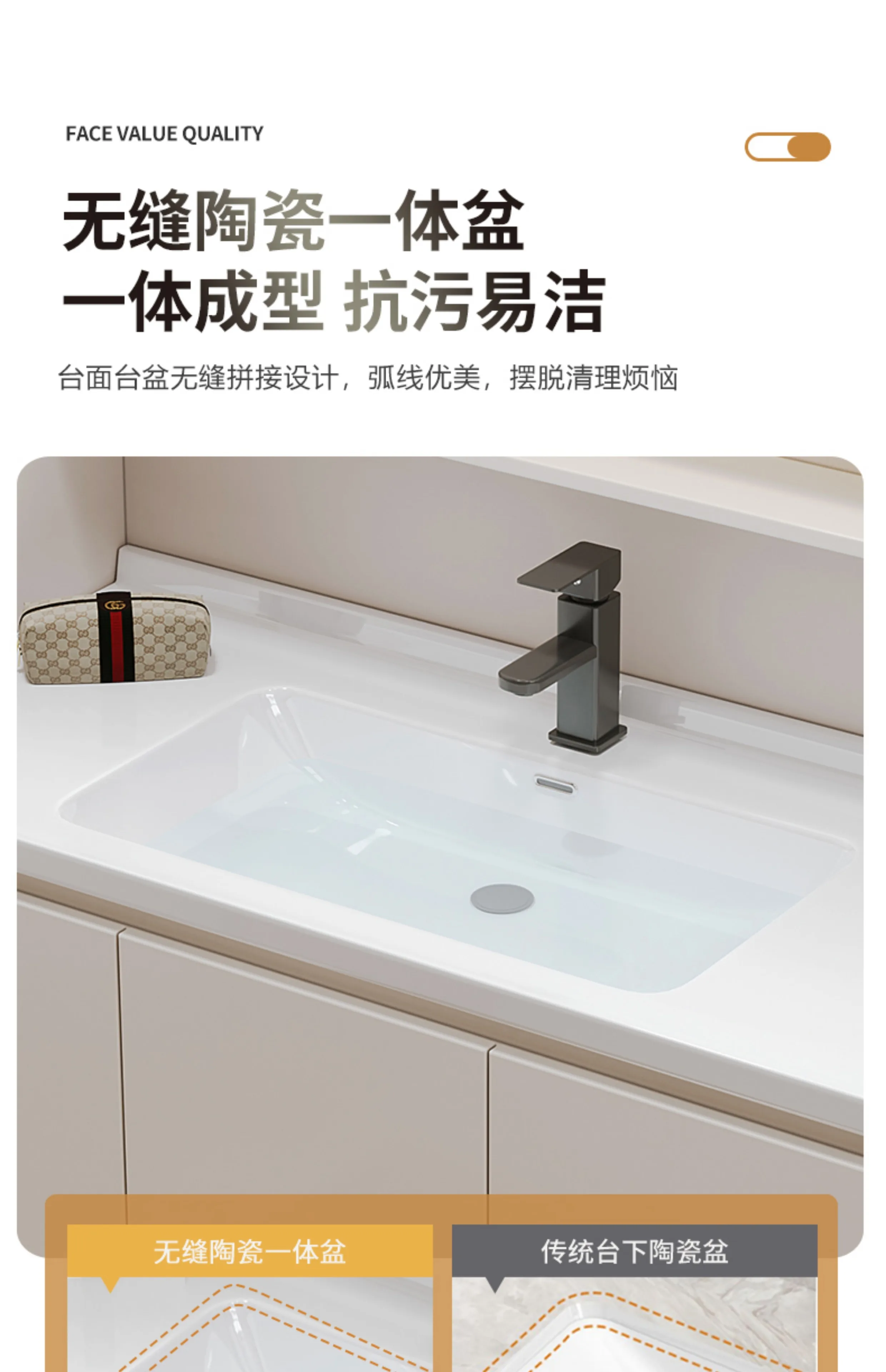 - Countertop type: Integrated ceramic basin