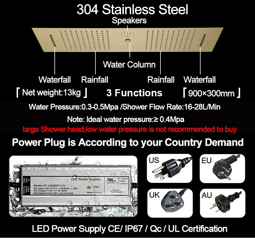 - Gold Shower Set Function: Rainfall,Waterfall,Water Column,Hand Shower