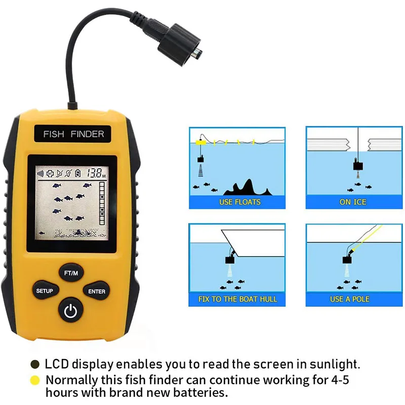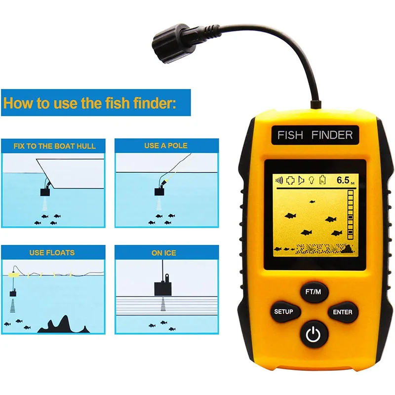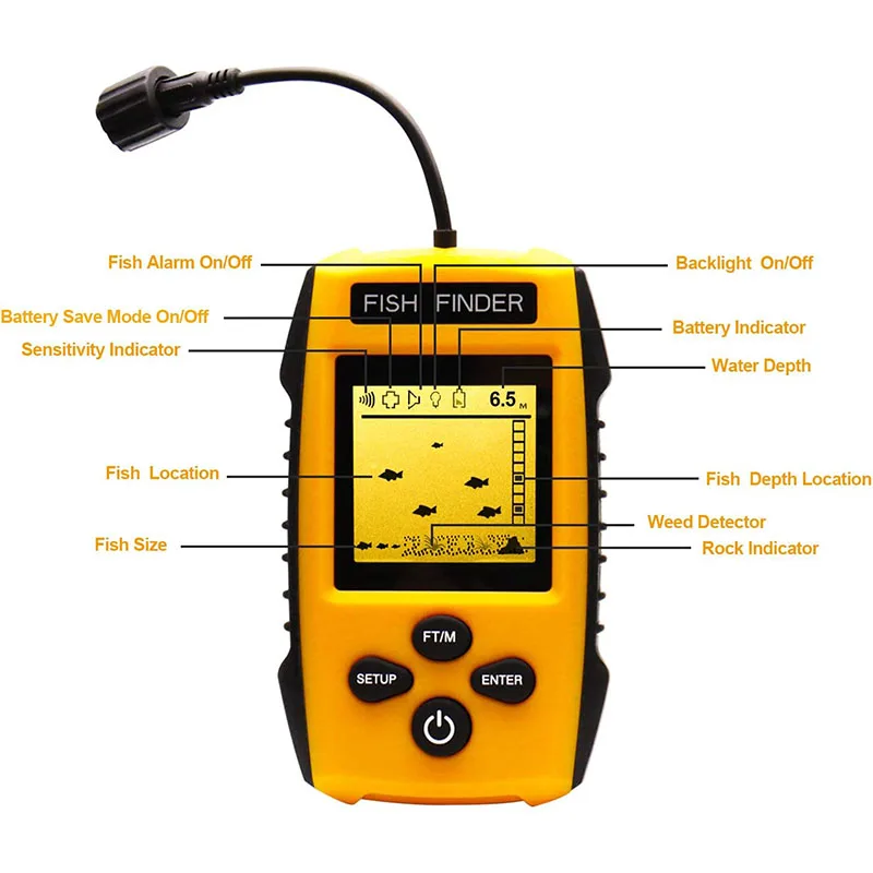 Easy to Use: Toss the transducer into water and turn on the display unit, it will show you the water depth and approximate fish depth if fish schools passing by. It has 5 user selectable sensitivity; battery save mode; backlight mode ; fish alarm; unit of measure. Setting can be saved when turned off.
