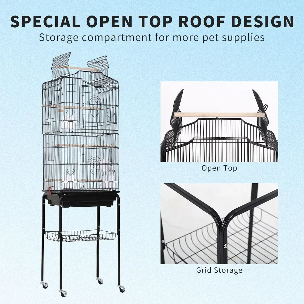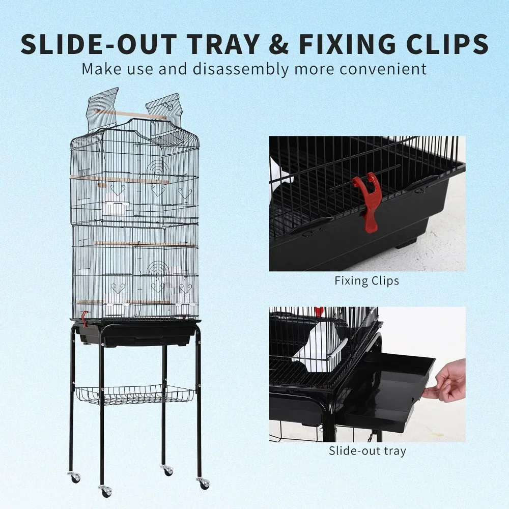 Pet-parent Friendly: You can easily lift and move the cage by holding the two handles on top. Each front door has two small entrances. The side panels feature 4 feeding doors for easy seed and water refilling. The extra storage shelf on the stand can keep bird cage cleaning tools, bird seeds and toys