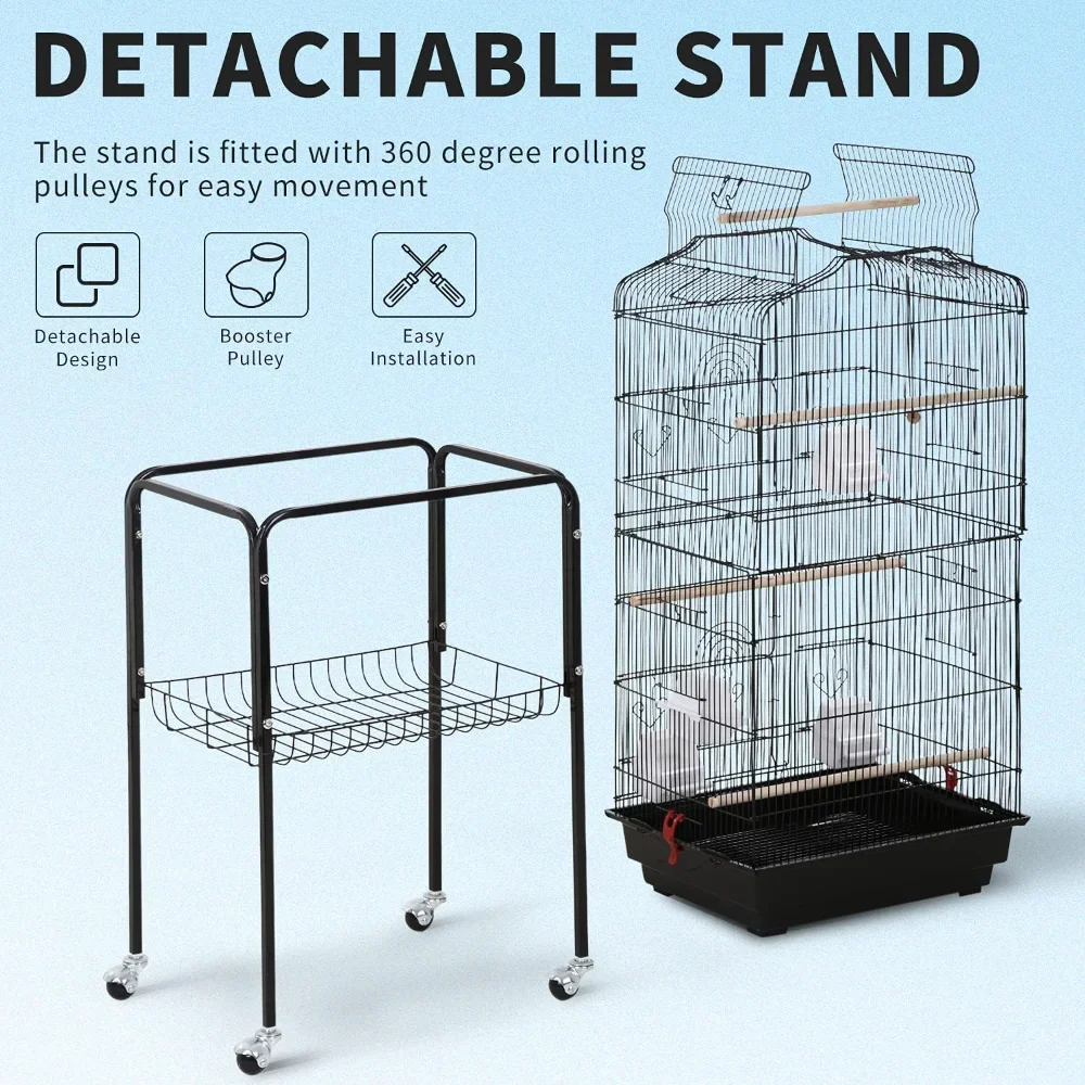 Detachable Rolling Stand: This rolling bird cage sits on four 360-degree swivel ball-shaped wheels, making it effortless to move around. The upper cage can be used separately thanks to the detachable design. You can place/carry the cage without the stand at will