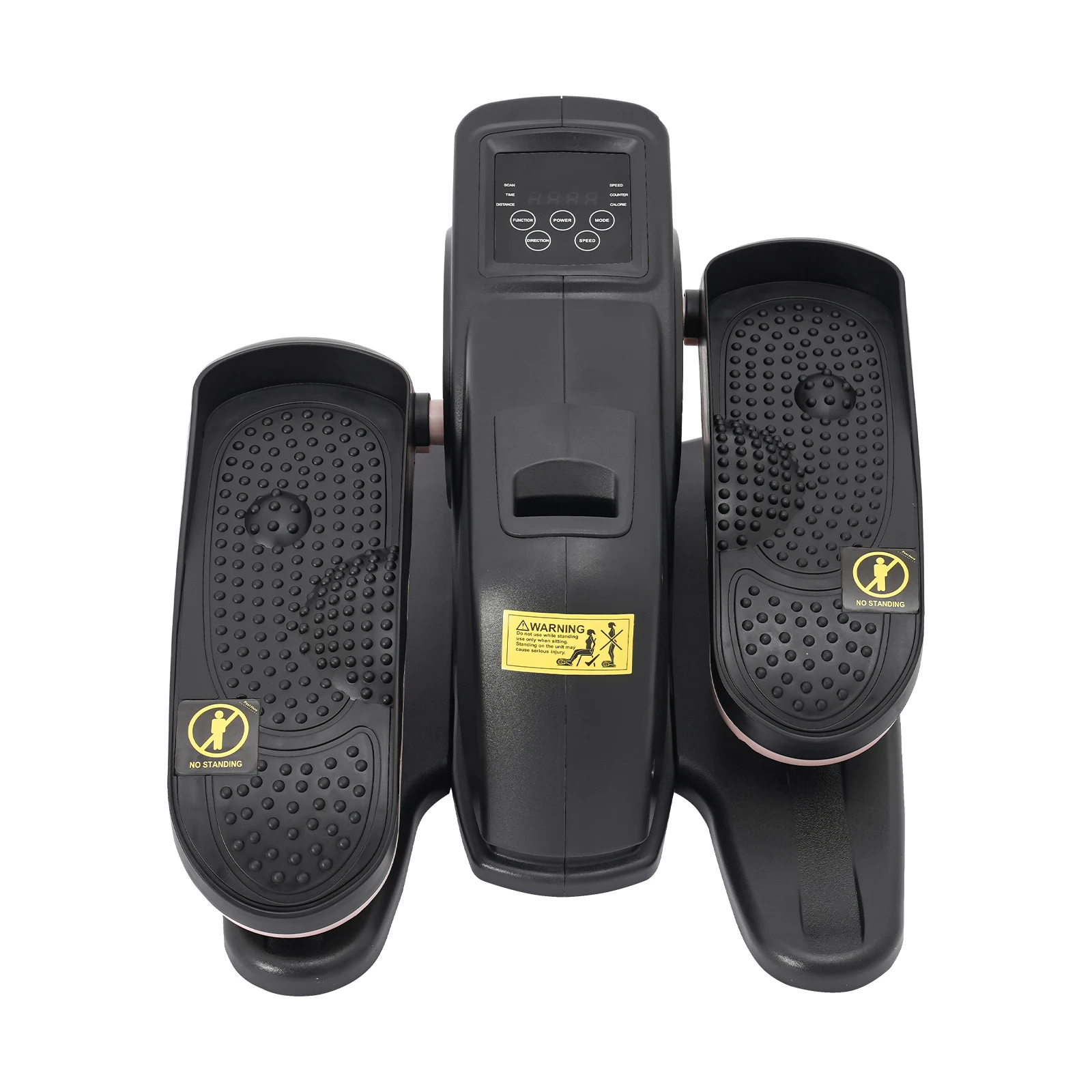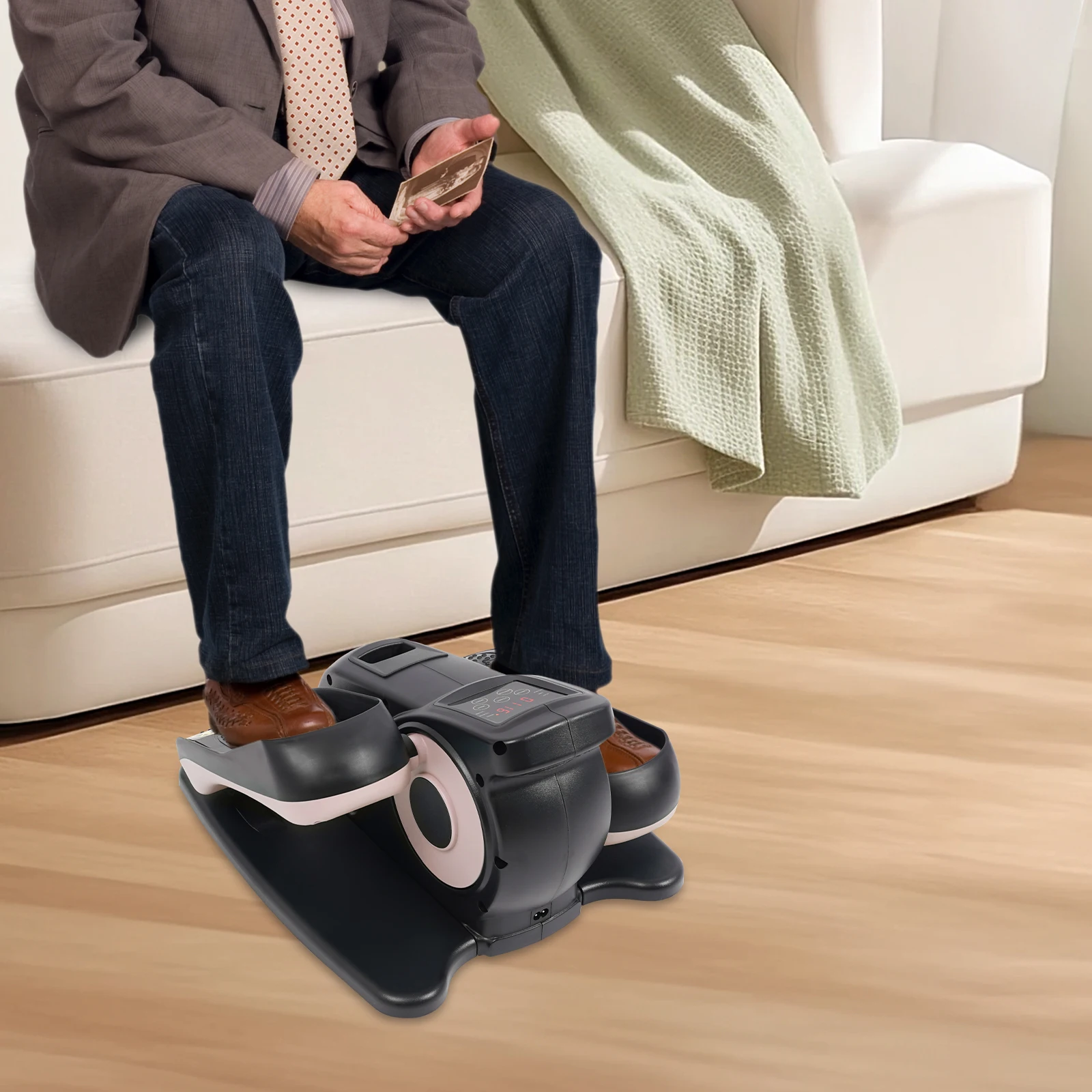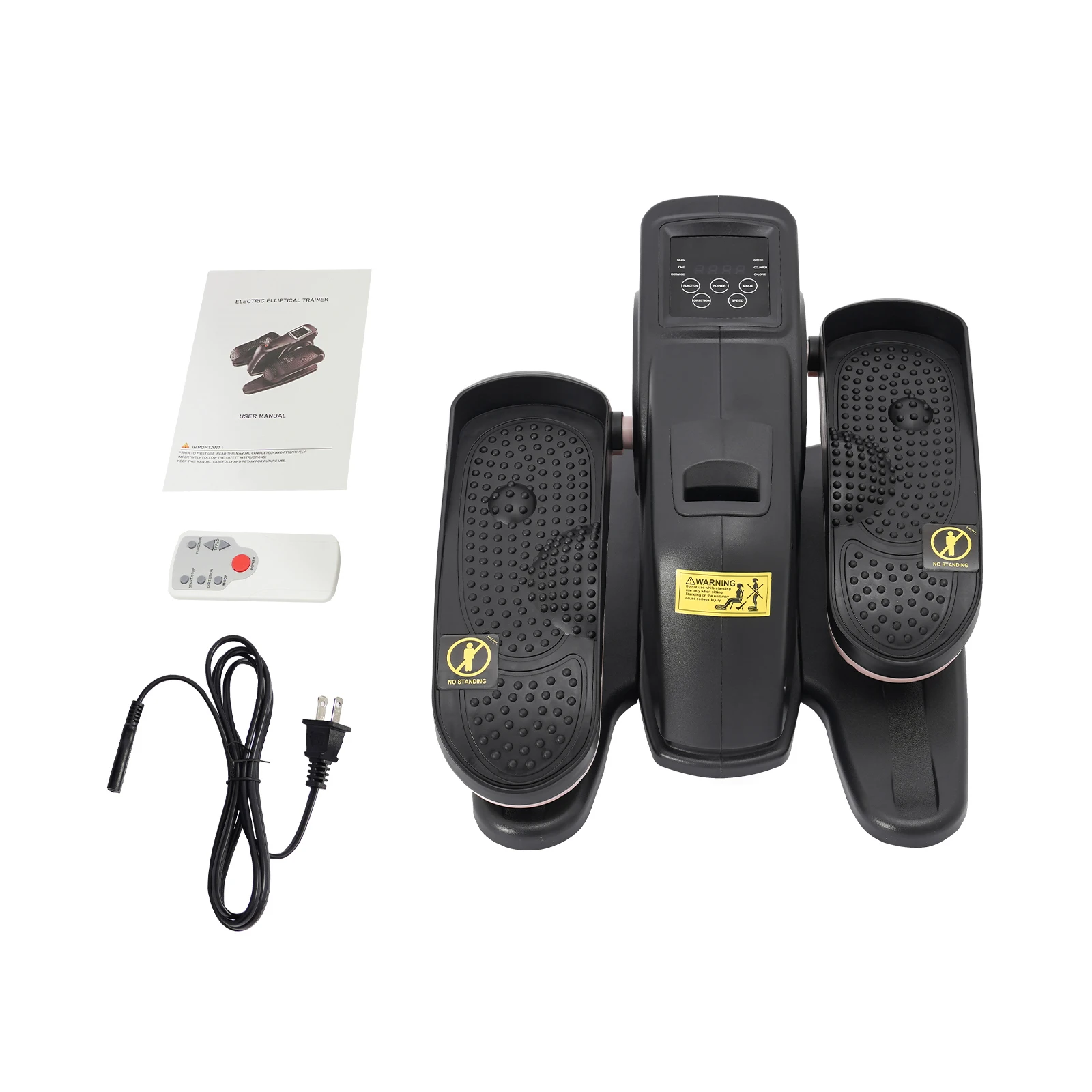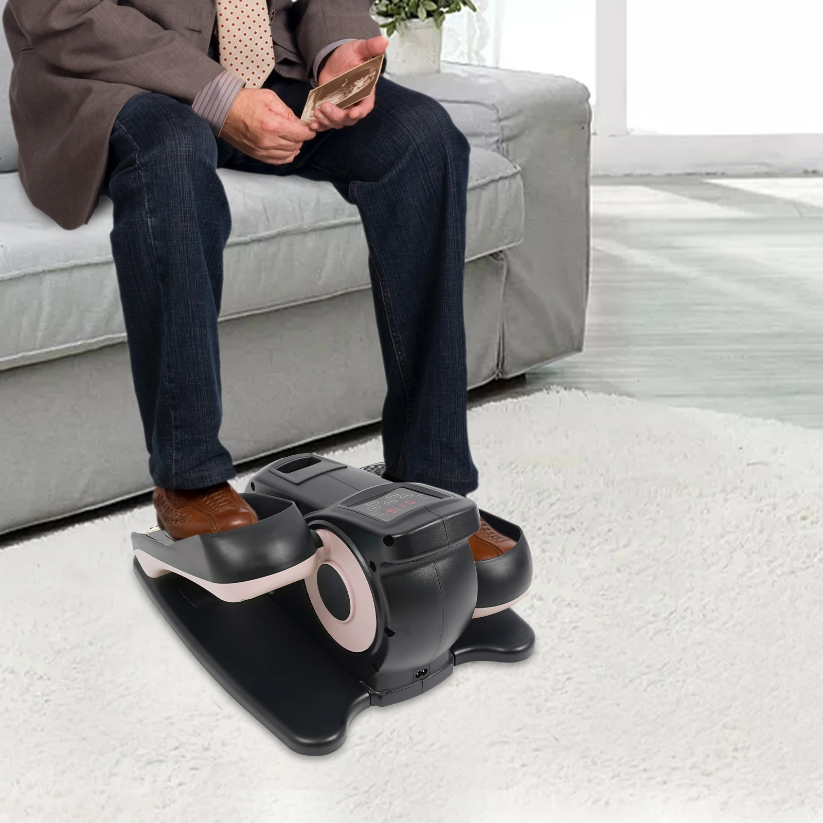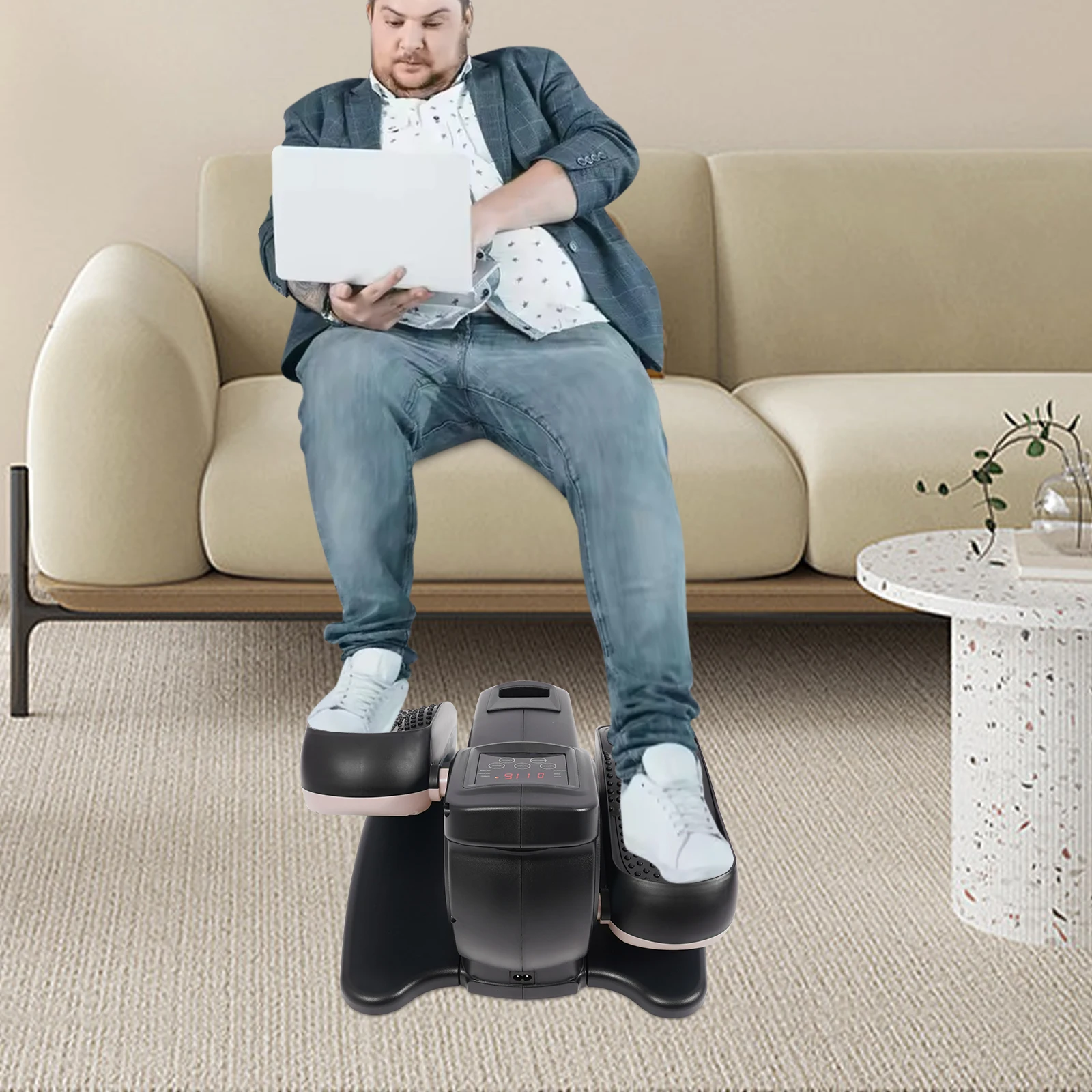 This is a multifunctional portable pedal exerciser for the legs. Its compact size makes it suitable for both home and office use. The LCD shows information such as time, counter, and speed. The anti-slip pedals and safety warning signs to ensure user safety, and remote control for easy setting adjustments. In short, it is a well-designed, fully functional, and safety-focused exerciser that can help you effectively exercise your legs.