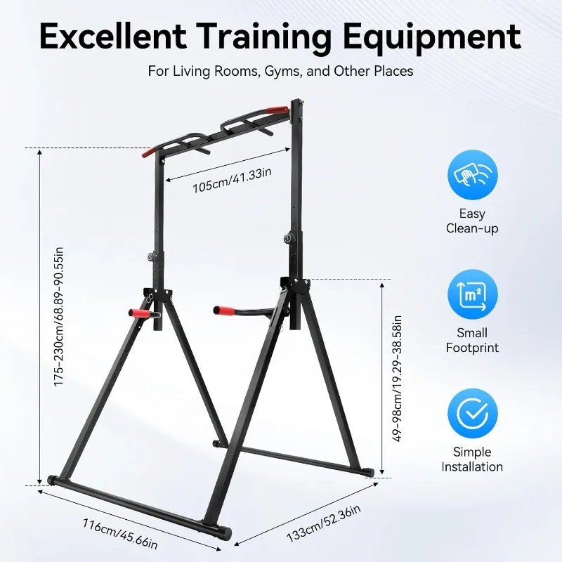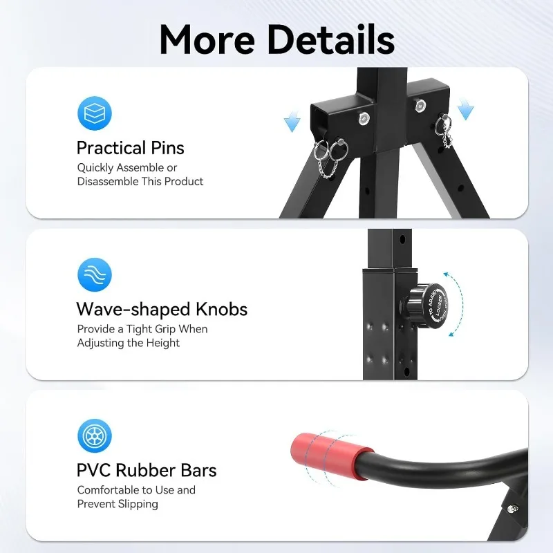 - ★Adjustable Height: The height of the horizontal bar can be adjusted from 5.74 ft to 7.55 ft, which can fully meet the needs of people of different heights. The height of the parallel bars can be adjusted from 19.29 inches to 38.58 inches according to the types of exercise.
