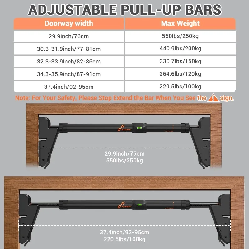 - Double Safety Lock System: Equipped with a 360° rotatable dual gear lock, Sportneer pull up bar for doorway prevents loosening during use. It’s been rigorously tested for safety, allowing users to exercise with confidence in its sturdiness