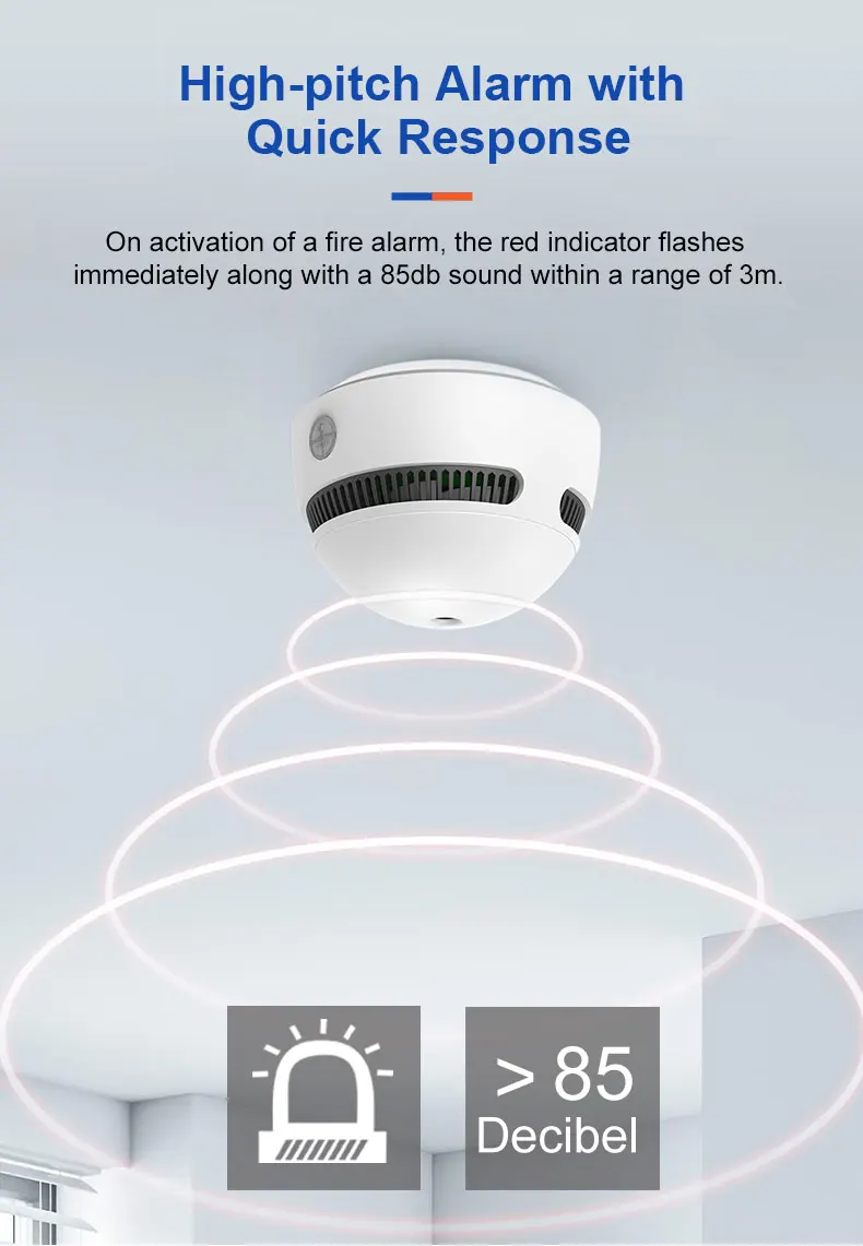 Alarm Loudness: ≥85 dB at(3m) @3.2 +0.3 kHz pulsing alarm