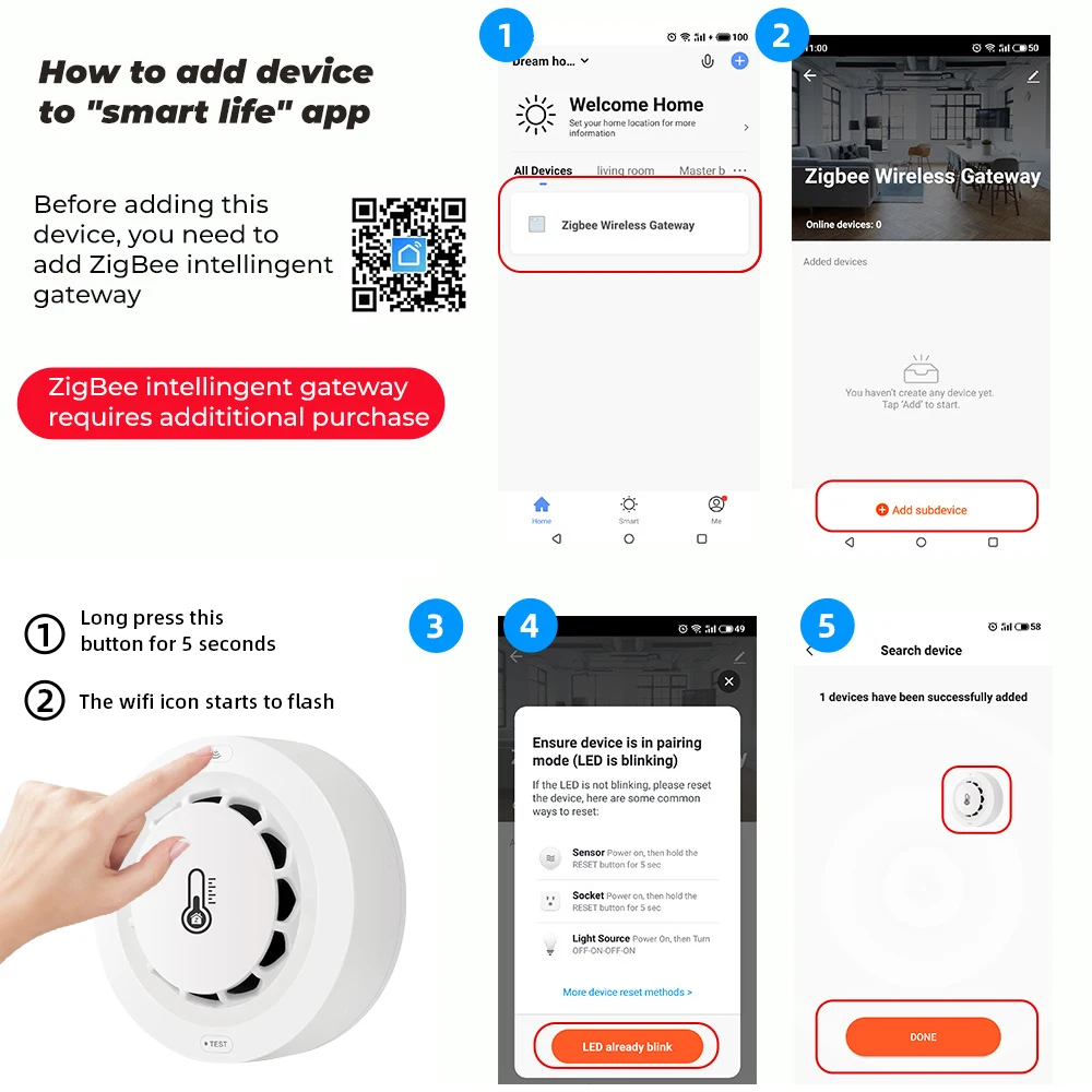 This product is an intelligent Zigbee photoelectric smoke sensor. It is able to detect the presence of smoke and temperature and humidity in real time. Once the danger of fire smoke is detected, the red LED of the sensor will illuminate and alarming to remind you and your family in time. It can be widely used in homes, lounges, coffee shops, dance halls and other places where fire alarm monitoring is required. (This sensor cannot detect gas/heat/fire.)