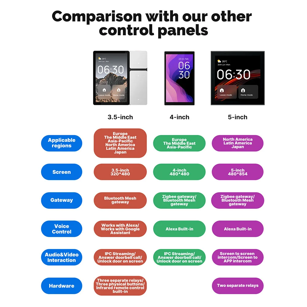 5. Asymmetric Button Design: The multi-functional touch screen control panel features a three-zone, two-segment asymmetric button design with three recessed infrared remote control LEDs, maximizing the infrared control angle for enhanced device management. It supports more than 110 device categories, unlimited number of devices and scenes, and supports 12 categories of infrared device control.
