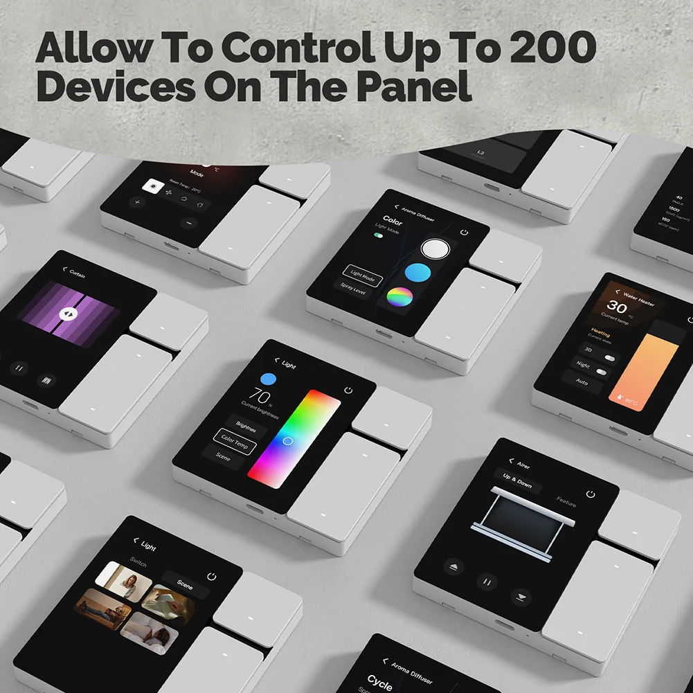 5. Asymmetric Button Design: The multi-functional touch screen control panel features a three-zone, two-segment asymmetric button design with three recessed infrared remote control LEDs, maximizing the infrared control angle for enhanced device management. It supports more than 110 device categories, unlimited number of devices and scenes, and supports 12 categories of infrared device control.