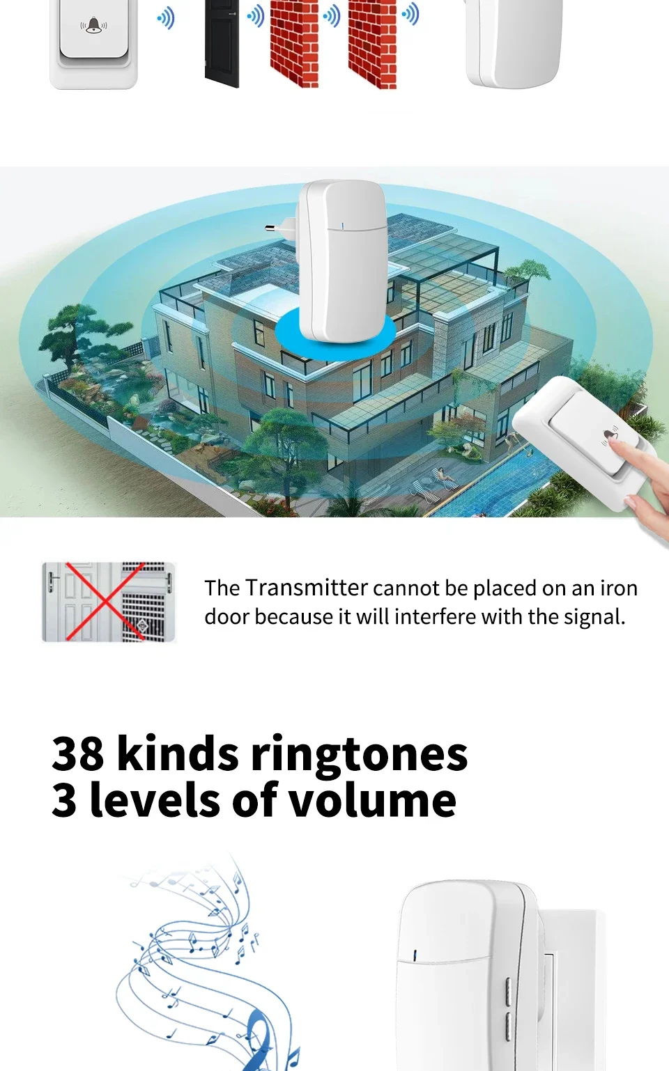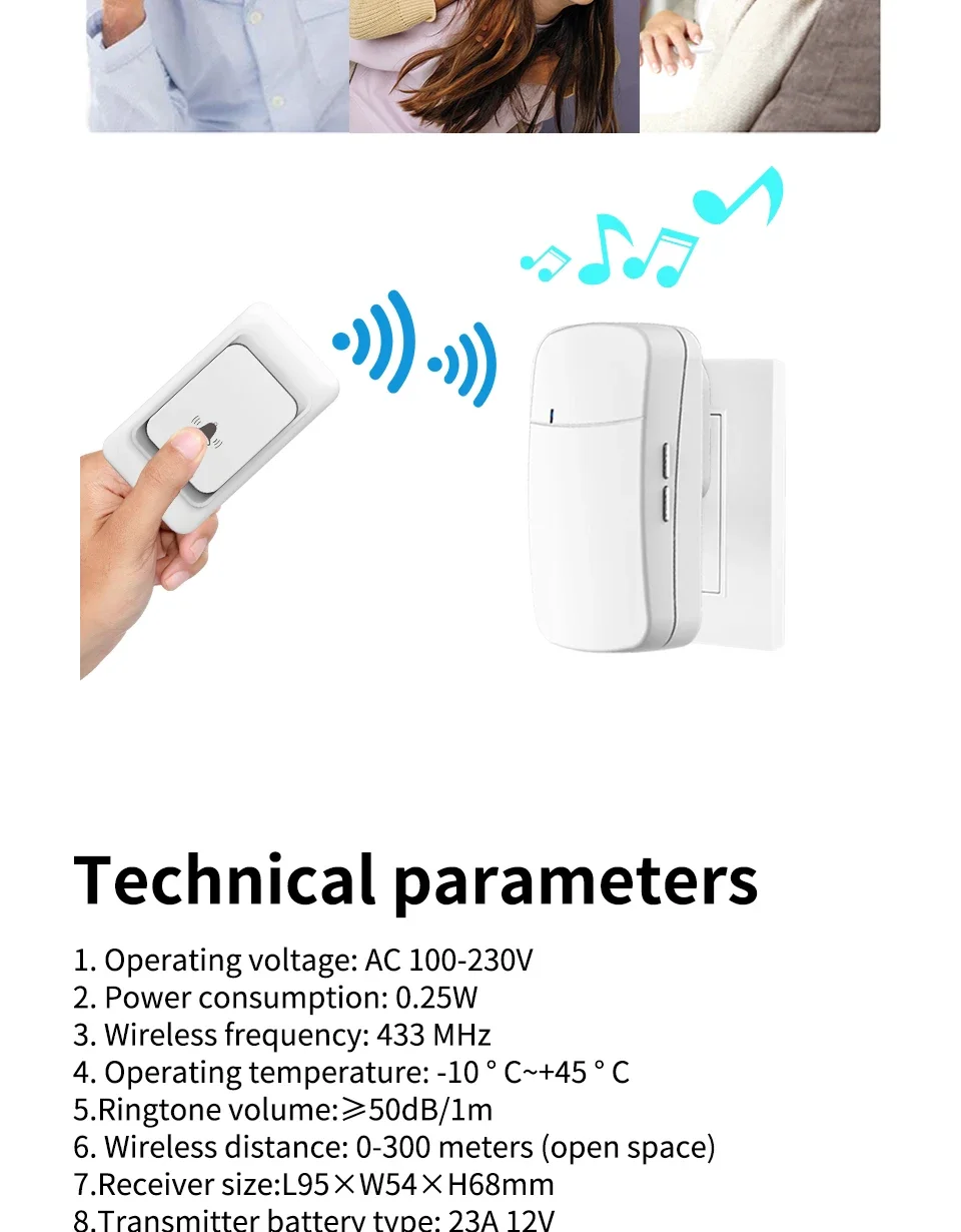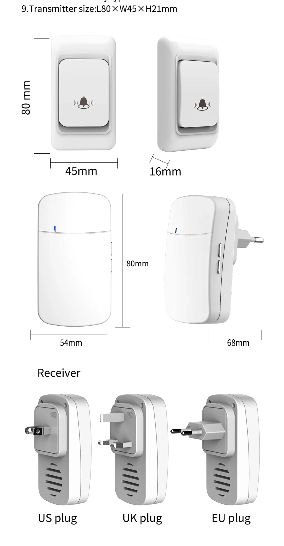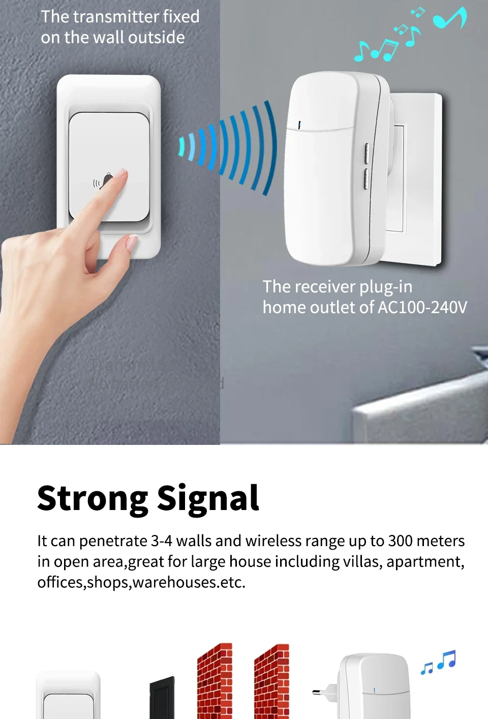 • Wireless Doorbell Self-Powered No Battery Waterproof IP44 Wide Voltage 110-240V Global Plugs Long Range Remote Control CE