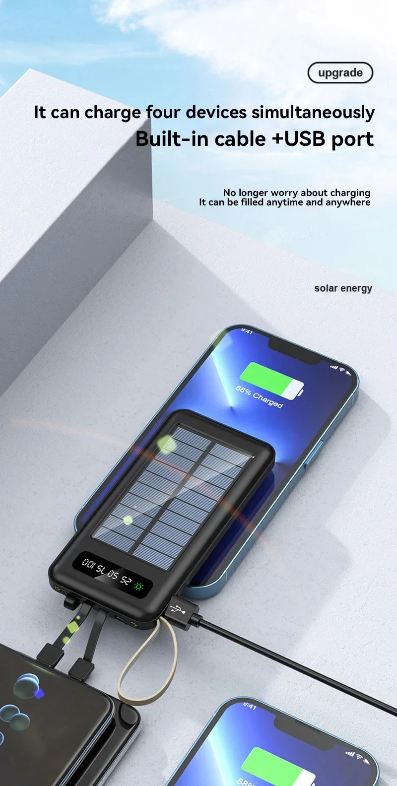 - Features: With Solar Panel,With Flashlight,Built in Cables,Digital Display
