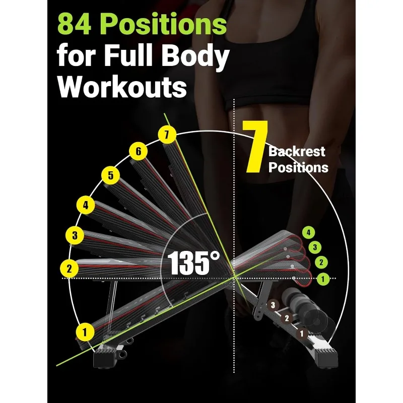 - 【84 Adjustable Options& Fast Adjustment】 This workout bench offers 7 back adjustments, 4 seat adjustments and 3 leg adjustments. So this adjustable weight bench is also an incline, decline, or flat bench. It means you can perform movements on any of those planes. The ladder-style adjustment is fast and secure because a user can adjust it in a few seconds